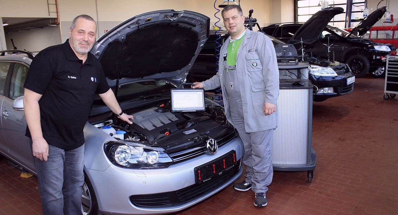 Die Kfz-Meister Stefan Günther und Jens Dietrich (von links) zeigen, wie’s geht: Über das Diagnosegerät wird die neue Software aufgespielt.