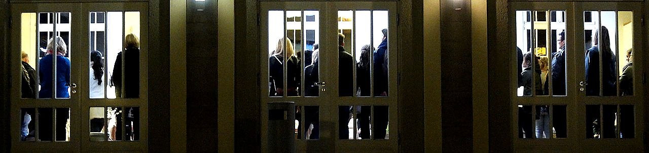 Die Macher der Ausstellung hatten die Türen zum großen Saal abgeschlossen und erst zwei Minuten nach 18 Uhr geöffnet. Warum das so war, bleibt ihr Geheimnis, konnte man doch durch den Fenster einen Blick auf die 55 Bilder werfen.