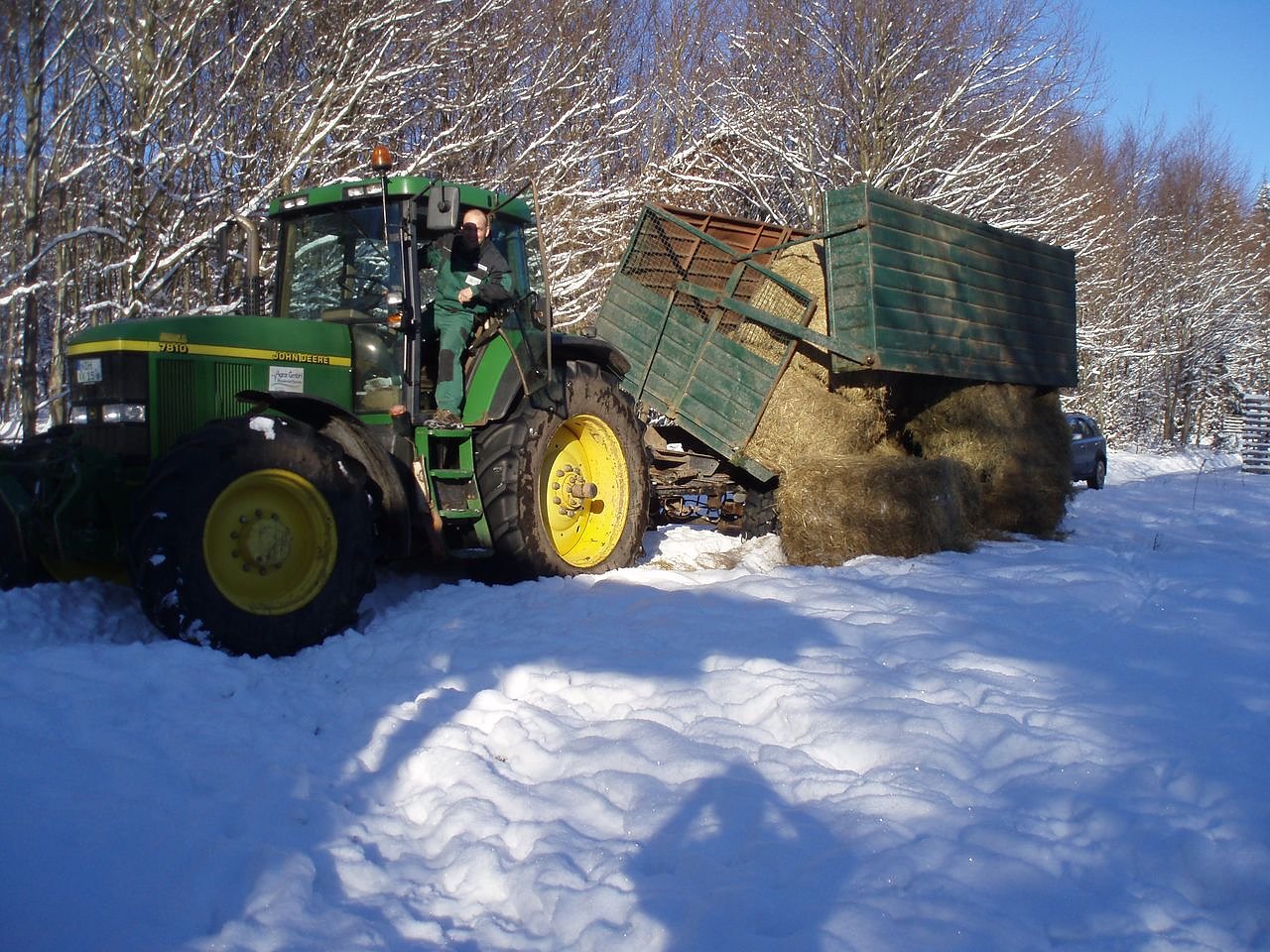 Da niemand im Voraus sagen kann ob eine Notzeit eintritt und vor allem wann werden die Fütterungen mit Heu von den Waldwiesen gefüllt und bei Bedarf wird Heu von den einheimischen Agrargenossenschaften zugekauft und von diesen auch zu den Fütterungen angeliefert. Im Bild zu sehen ist eine solche Anlieferung durch die Agrargenossenschaft Mauderode, von der Abladestelle wird das Heu dann mit dem forstamtseigenem Traktor auf die umliegenden Fütterungen aufgeteilt.