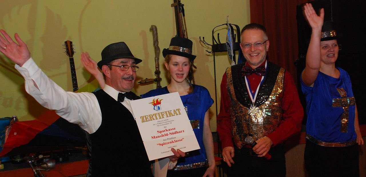 Die Minute der Wahrheit rückte heran, als Herr Weiss seine herrlich-gefährlich rote Mappe öffnete, dem Präsidenten vor sich tief in die hinter Brillengläsern funkelnden Augen sah und verkündete: Bestanden! Jubel brauste auf unterm Volk, Herr Zeidler atmete erleichtert ein und aus, Herr Weiss holte ebenfalls tief Luft, um dann zu verkünden: Das Sparkassen-Gütesiegel bekommt für eine tolle Karnevalssession mit Witz, viel Spaß und bester Unterhaltung der 1. Eisleber Carnevalsverein, De Lotterstädter‘. Mit dem Gütesiegel erhält der Verein eine finanzielle Unterstützung der Sparkasse Mansfeld-Südharz aus dem PS-Zweckertrag in Höhe von 2.500 Euro.