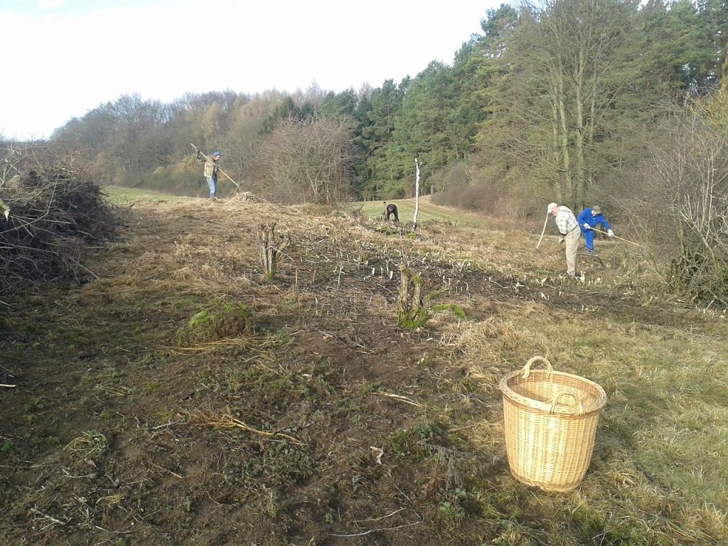 Ähnliche ehrenamtliche Einsätze führen wir in Absprache mit der Unteren Naturschutz- und der Forstbehörde seit nunmehr 2010 regelmäßig durch, mit zunehmender Frequenz: Auf Grund der nicht gebannten Notwendigkeit, die letzten Refugien seltener Arten in unserer Region gezielt zu erhalten, wird ein Einsatz pro Monat angestrebt. Zwischen Januar 2015 und 6.2.2016 waren es bereits neun Einsätze. Ohne die Bereitschaft unserer Mitstreiter, sich regelmäßig fast einen ganzen Sonnabend lang körperlich selbstlos für die Artenvielfalt zu betätigen, wären 35 Einsätze im bisherigen Umfange nie möglich gewesen. Natürlich ist jeder Einsatz auch ein soziales Erlebnis mit entspannten Gesprächen und einem kleinen Imbiss– insgesamt wohl eine kleine Auszeit vom meist Üblichen. Allen, die seit 2010 mitgewirkt haben, sei an dieser Stelle ganz herzlich gedankt. Gedankt sei aber auch der Forst- und der Unteren Naturschutzbehörde sowie den Flächeneigentümern. Ohne die Genannten läuft eigentlich gar nichts.Keinesfalls zuletzt möchten wir die Naturstiftung DAVID aus Erfurt lobend erwähnen: Sie finanzierte uns einen unserer beiden leistungsfähigen Freischneider sowie mehrere Heuharken wohlwollend mit. Das Geld, liebe Naturstiftung, ist gut angelegt.