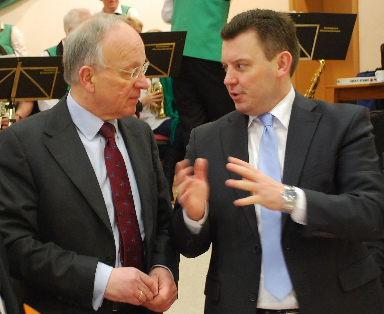 Der Mifa-Neubau verschlingt landwirtschaftliche Nutzfläche. Aber sichert im Idealfall hunderte Arbeitsplätze in der Region. Sachsen-Anhalts Minister für Landwirtschaft und Umwelt, Dr. Hermann Onko Aeikens (l.), und der Landtagsabgeordnete André Schröder (beide CDU) im Gespräch beim CDU-Frühschoppen in Klostermansfeld. (Foto: Jochen Miche)