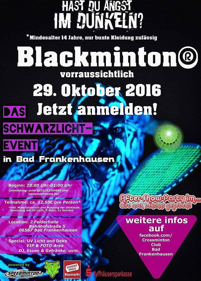 Es ist ein farbenfreudiges Badminton im Schwarzlicht, bei der nur bunte Kleidung erlaubt ist. Das sportliche Event der besonderen Art, verbunden mit einer After-Show-Party.Man muss allerdings älter als 14 Jahre sein, um teilnehmen zukönnen.