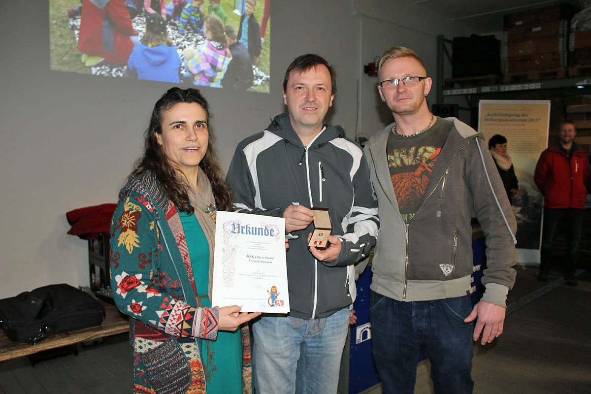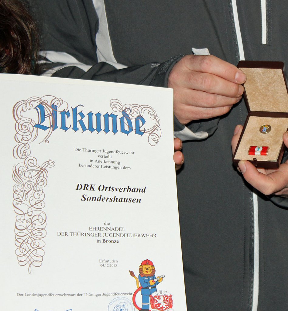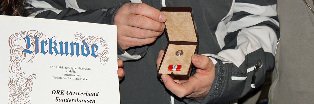 Der Thüringer Jugendfeuerwehrverband zeichnete den Ortsverband des DRK Sondershausen mit der Ehrennadel in Bronze des Thüringer Jugendfeuerwehrverbandes aus. Die Ehrennadel war gestern übergeben worden.