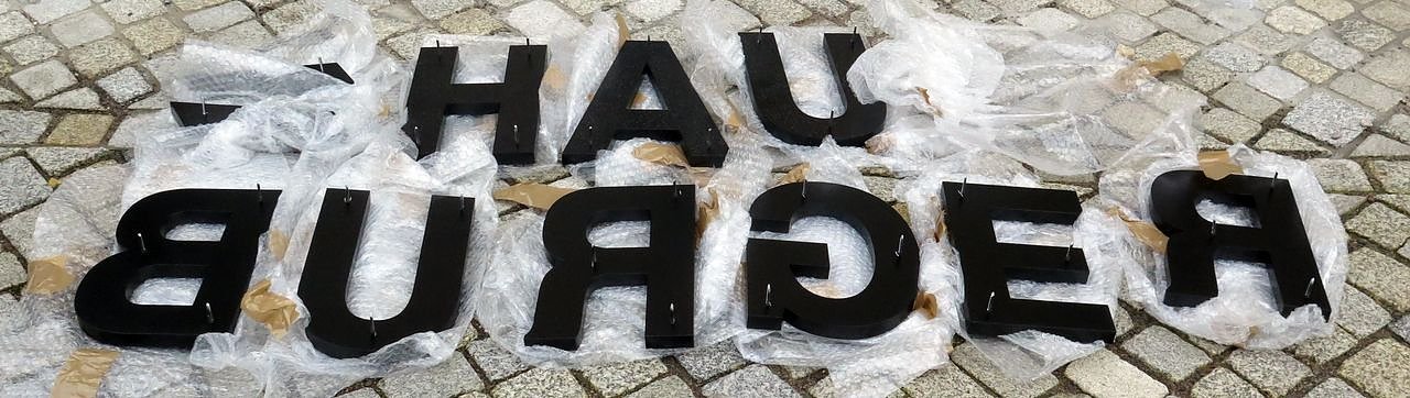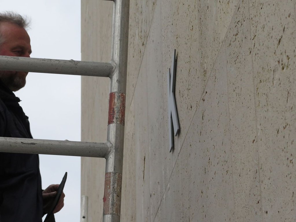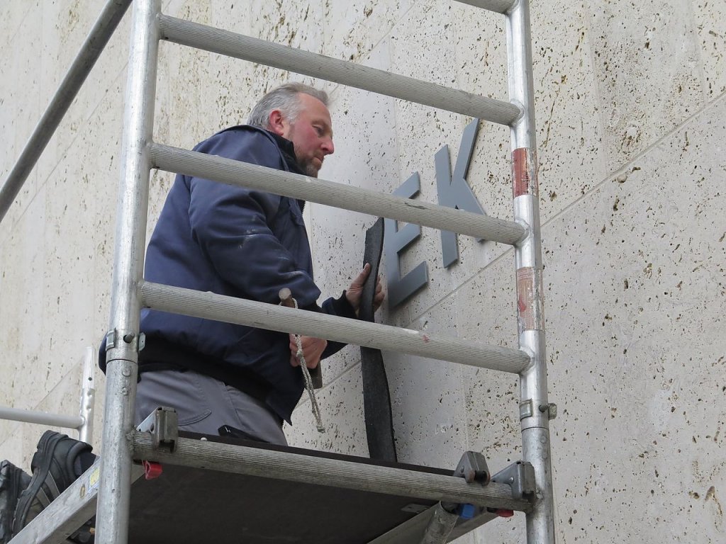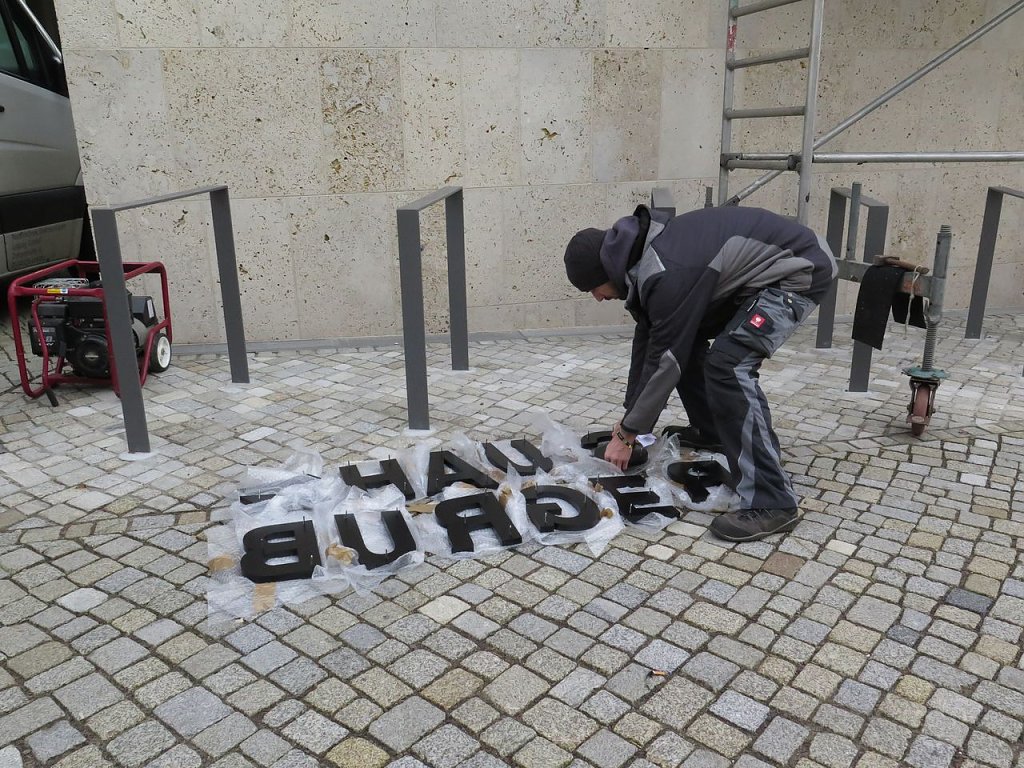 Zwei Mitarbeiter der Firma NEL aus Leipzig sind an diesem Vormittag dabei, die zwei Namenszüge "Stadtbibliothek" und "Bürgerhaus" an die Fassade zur Bäckerstraße anzubringen. Erst einmal wurden die einzelnen Buchstaben ausgelegt, dann wurde die Aluminiumoberfläche noch einmal poliert.