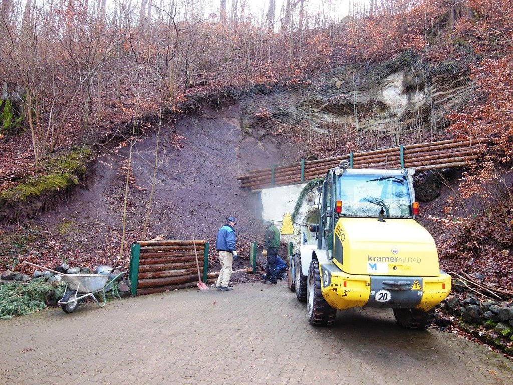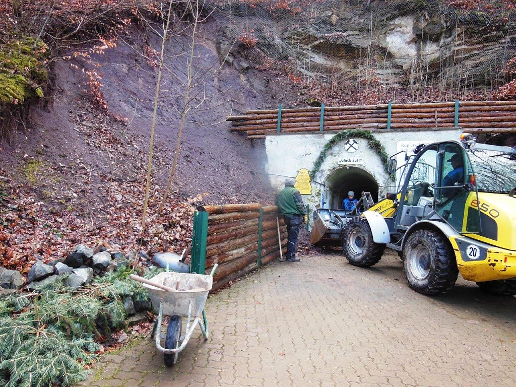 Unterstützung kam auch von der Ilfelder Bergsicherung. Im Rahmen der Ausbildung haben die beiden Azubis Robert Wilke und Jacob Jünemann unter Anleitung von Harry Dresler tolle Arbeit im Bergwerk geleistet. Im Außenbereich ging es mit schwerer Technik zur Sache.