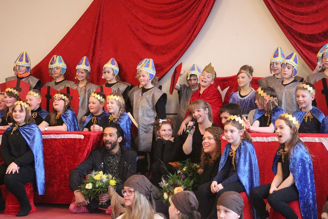 Auf dem Programm stand in diesem Jahr das Musical "Der König hat Geburtstag". Nur hat der daran gar keine Freude sondern hängt Träge auf dem Thron und wird nur dann richtig munter, wenn es was zu essen gibt. Vor allem Fast Food. Seinen Untertanen gefällt das gar nicht, sie hätten lieber einen fröhlichen König. Und so versuchen die Ritter, Edelleute, Handwerker und Bauern ihren Monarchen mit Musik und Tanz aufzumuntern. Es wird nicht zu viel verraten wenn man preis gibt das dass am Ende auch gelingt und zum großen Fest gesunde Speisen auf den Tisch kommen.