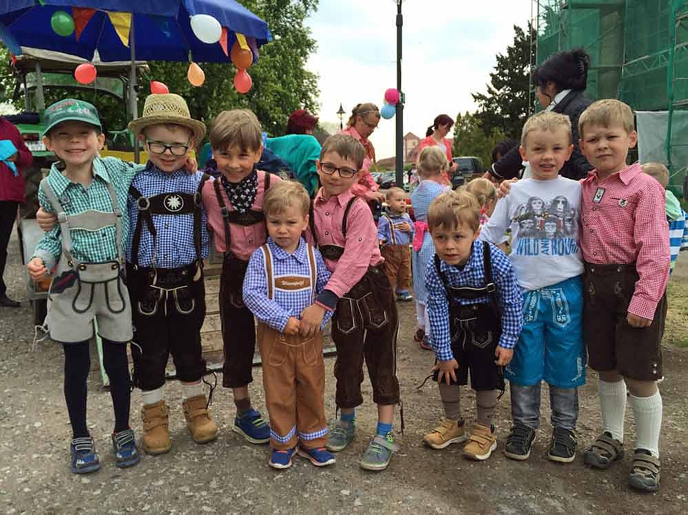 Der Einzug der Kinder mit einem Traktor und Anhänger war für alle Beteiligten bereits das erste Highlight. Im Dirndl und Lederhose eröffneten die Kinder zusammen mit den Erziehern der Kita Wipperfrösche und unseren Mitarbeitern der sozialen Betreuung mit einem Programm das Fest.