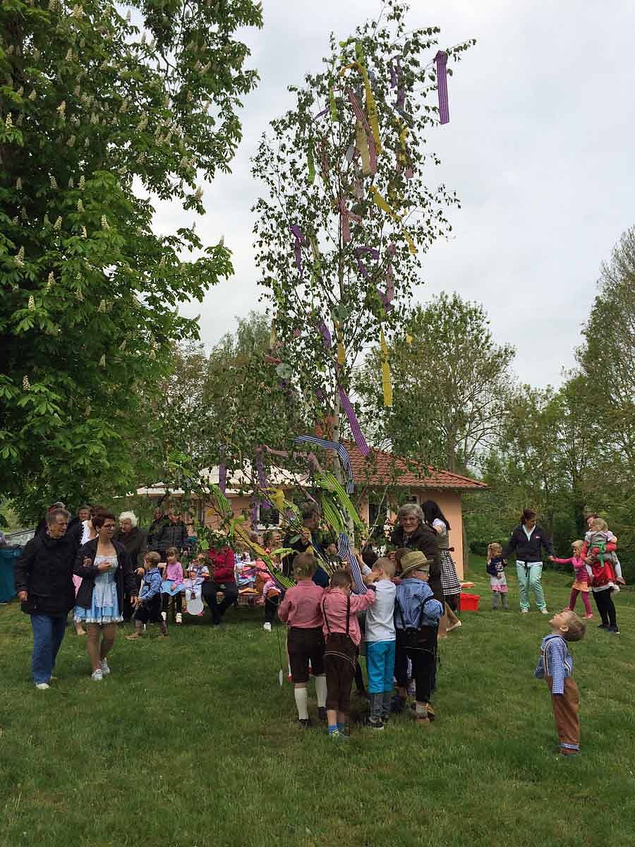 Anschließend schmückten die Kinder gemeinsam mit den Bewohnern den Baum mit bunten Bändern und richteten ihn zusammen auf. Schwungvoll und mit guter Laune wurde um den Maibaum herumgetanzt. Nach getaner Arbeit konnten sich alle mit Spezialitäten vom Grill und Eis stärken.