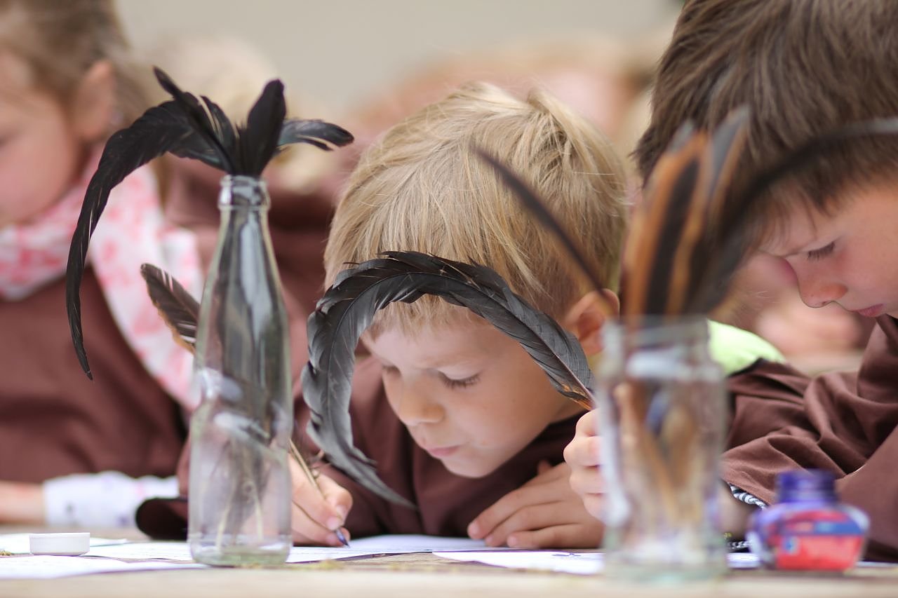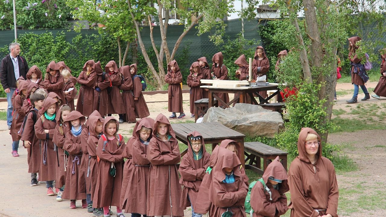 Mit den selbst genähten Mönchskutten hatten die Schulkinder die Möglichkeit, an verschiedenen Stationen, das Leben und das Arbeiten als kleiner Mönch zu erleben. Die Kinder konnten nähen, filzen, weben, Papier herstellen oder mit Feder und Tinte schreiben. Es wurden Kräuteröle und Salben angefertigt oder auch Stempel für die handgeschriebenen Briefe. Im Außenbackofen wurde das Mittagessen vorbereitet- Mönchsburger und Suppe. Vor dem Essen ging es schweigend über den Schulhof zum Mittagsgebet. Toll war das Schreiben mit Feder und Tinte, so Kornelius aus Jahrgang 1.