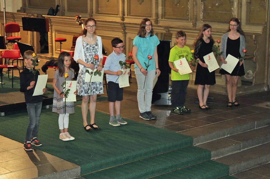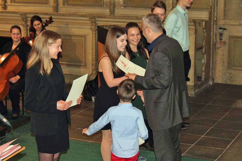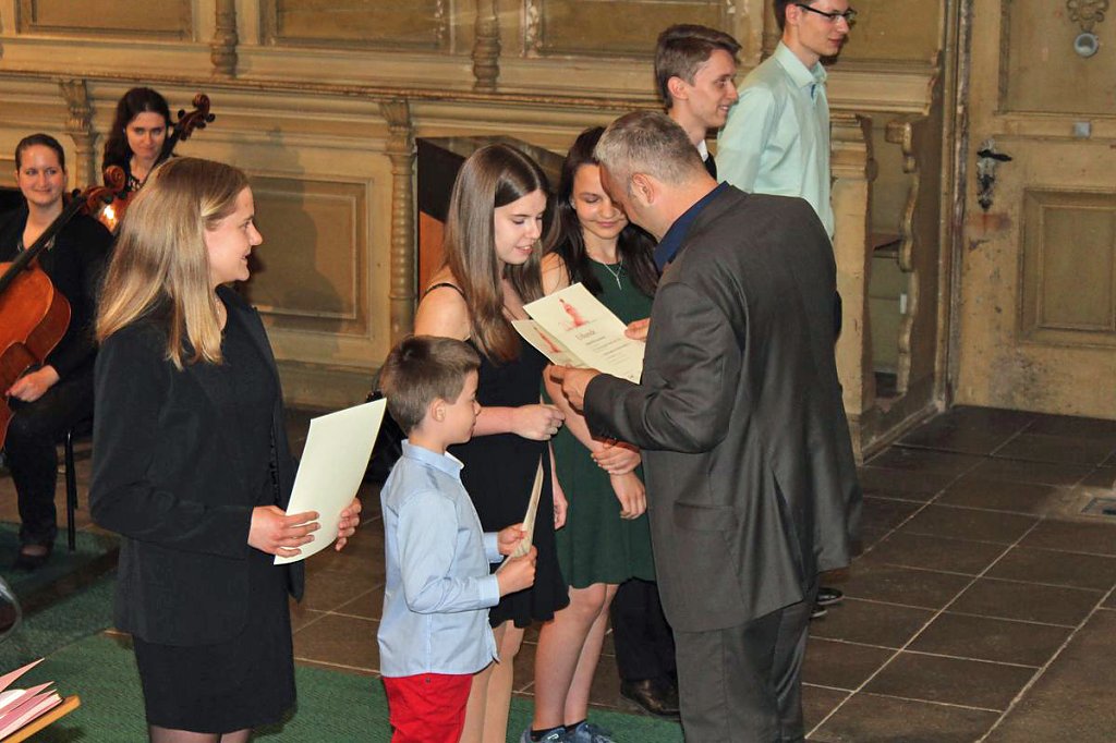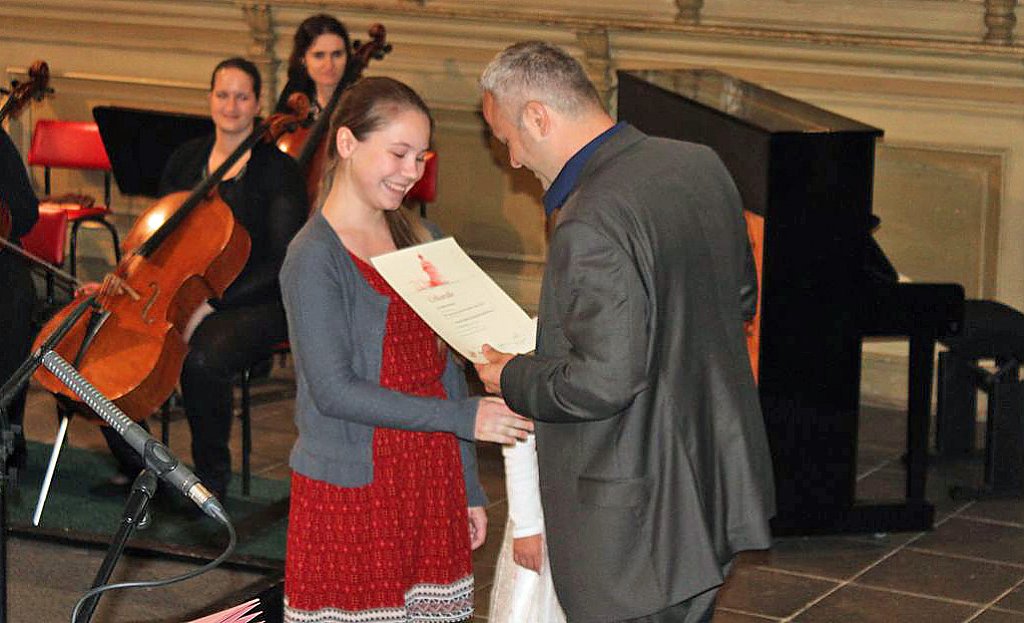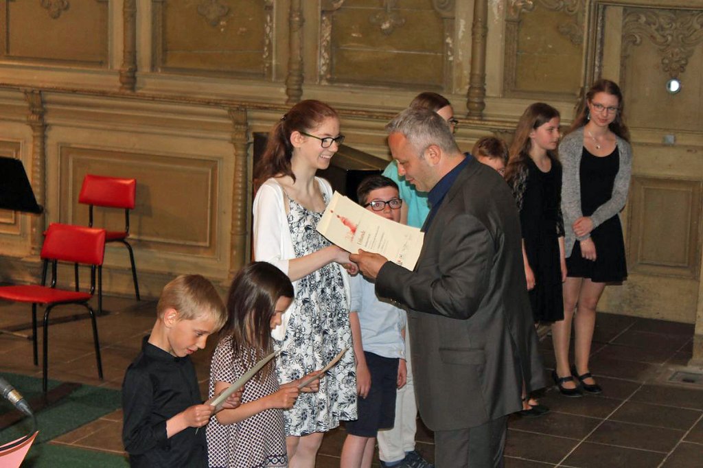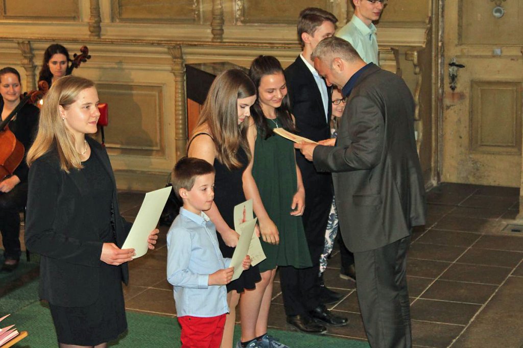 Dabei erhielten die Teilnehmer ihre Urkunde mit Angabe des Prädikats und der Punktzahl. Begleitet wurde die Veranstaltung vom Lohorchester Sondershausen unter der Leitung von Sergi Roca. Fünf Preisträger des Wettbewerbs hatten hier die Möglichkeit, ihre Leistung noch einmal in Begleitung eines Profiorchesters einem begeisterten Publikum zu präsentieren.