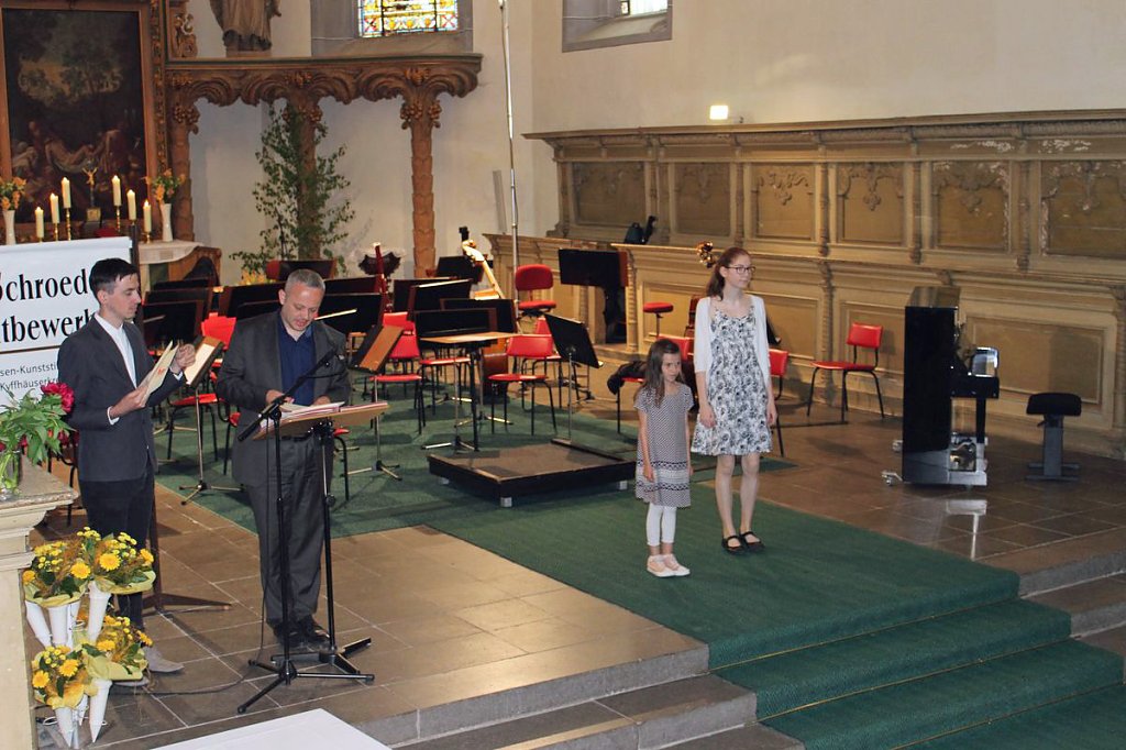 Wettbewerbsleiter Matthias Deichstetter, hier bei der Begrüßung bedankte sich in seiner Begrüßungsrede vor allem beim Landratsamt Kyffhäuserkreis, der Sparkassenkunststiftung für den Kyffhäuserkreis und den zahlreichen Sponsoren für die personelle und finanzielle Unterstützung. Auch dankte er seinem Kollegium und den zahlreichen Helfern im Hintergrund für die reibungslose Durchführung des Wettbewerbs. Darüber hinaus ging ein Dank an die Teilnehmern, Eltern, Pädagogen und Korrepetitoren für die aufopferungsvolle Vorbereitung auf diese bundesweiten Wertungsspiele.