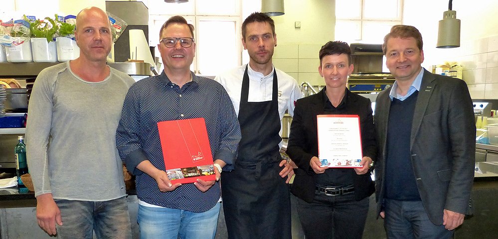 v. li. Thomas Schönfeld, Tobias Schneegans, Norman Köhler, Nadine Knirsch und Lars Tietje präsentieren die thematisch abgestimmte Festspielkarte des Restaurants Hofküche; Foto: Birgit Susemihl
