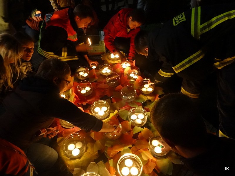 Schließlich neigte sich der Abend dem Ende. Mit einbrechender Dunkelheit zündete die Feuerwehr die 22 großen Seerosen aus Glas, die je mit drei Teelichtern bestück waren an und fuhren sie mit dem Floß in die Mitte des Teiches, um sie dort auszusetzen.