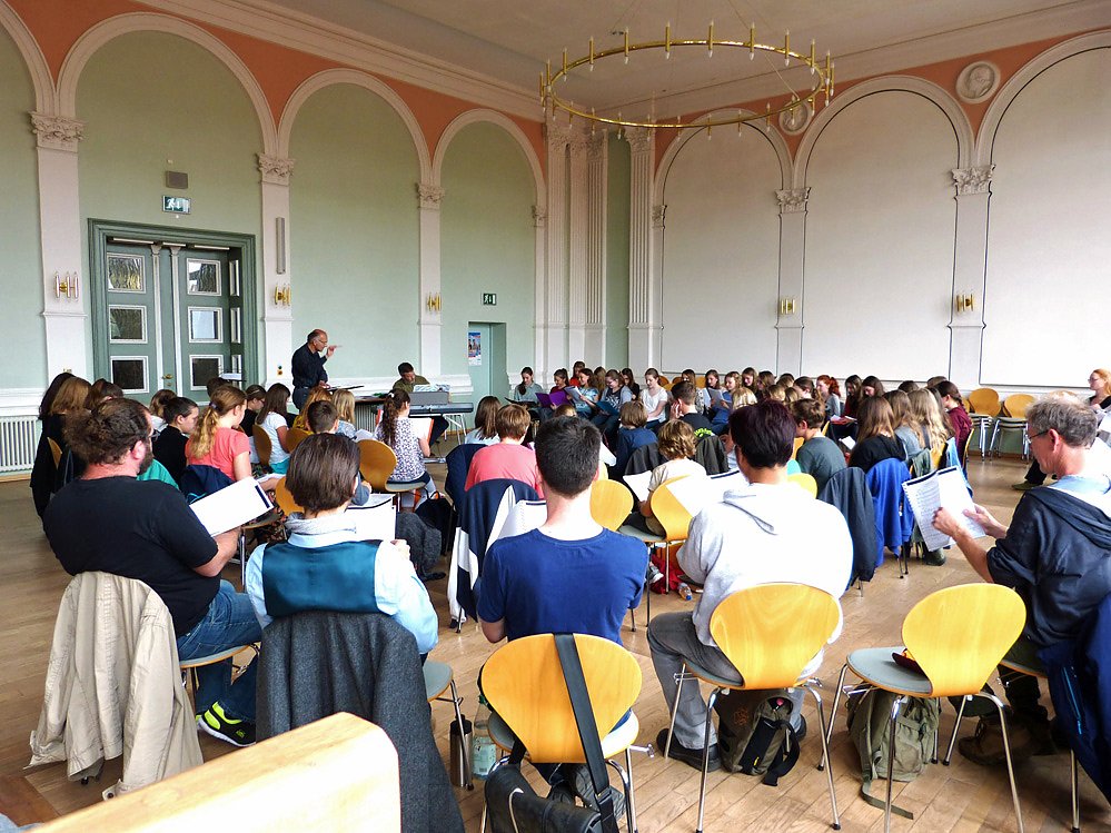 Gemeinsame Probe von Mittelstufenchor des Humboldt-Gymnasiums und Opernchor; Foto: Birgit Susemihl
