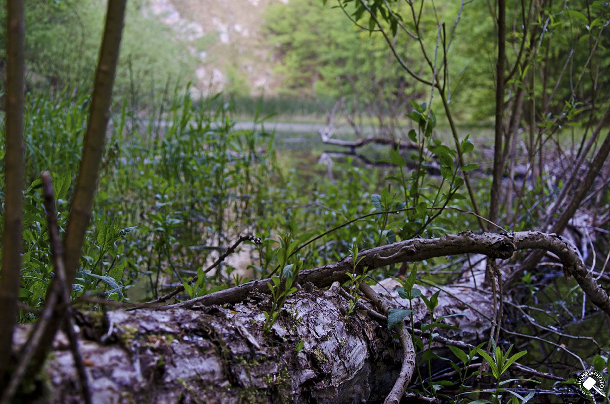 Auf schmalem Pfad führte der Karstwanderweg, der sich durch die Markierung mit dem K auf rotem Balken erkenntlich zeigt, in den Wald hinein. Sehr idyllisch, auch ein wenig mystisch zeigt sich hier die Natur, gar nicht so karg wie man es von einer Karstlandschaft eigentlich erwarten würde. Immer weiter talwärts führte der Weg, entlang von Wiesen, Feldern und Wäldern.