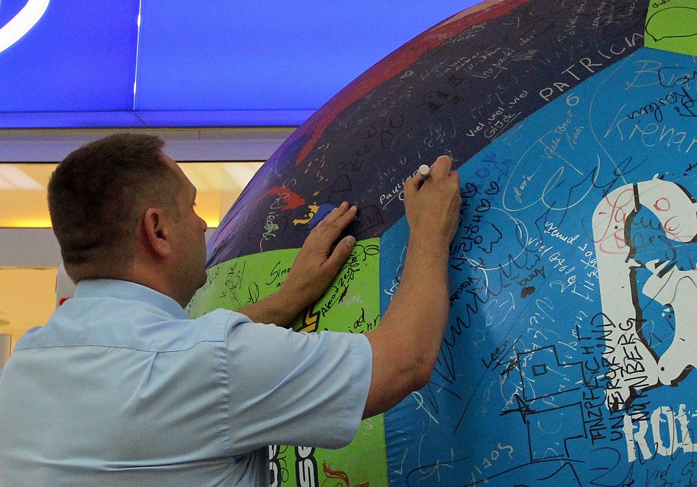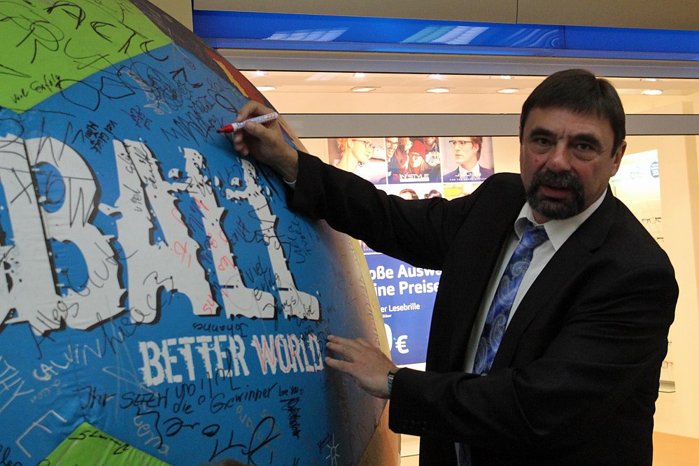 Mit einer Spende hatte Matthias Schulze (li.), Inhaber von Apollo-Optik, den Ball vor die Filiale in Sondershausen geholt und zusammen mit Sondershausens Bürgermeister durfte er sich am dem Ball mit einer Unterschrift verewigen.