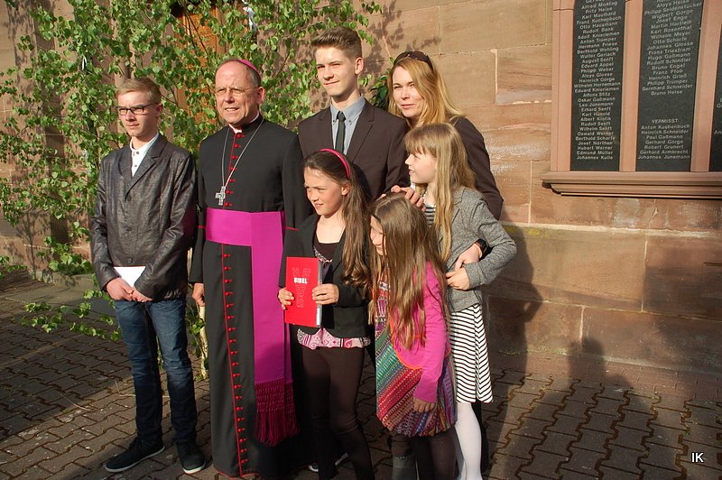 Die Paten hatten für die Firmlinge Grünpflanzen in zum Teil selbstgestaltete Töpfe gepflanzt als Symbol des wachsenden Samenkorns und der Erde. Die Musikgruppe Il Coro aus Beuren hatte sehr schön die Firmung musikalisch begleitet. Nach der Firmung wurden vor der Kirche noch viele Fotos gemacht. Beliebtes Motiv war natürlich der Bischof zusammen mit den Firmlingen, aber auch Geschwistern und Angehörigen. Bei vielen Feiern war eine Stunde später auch das Pokalspiel im Fußball ein Thema.