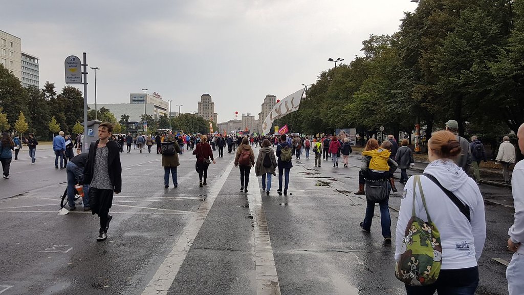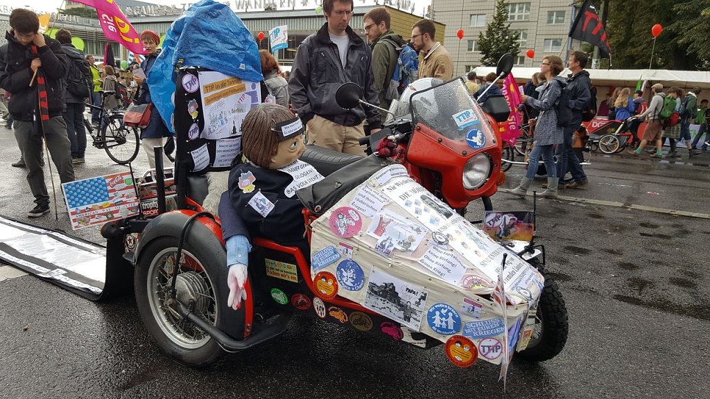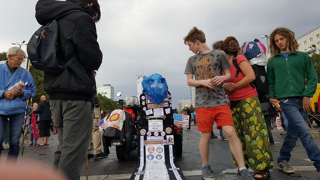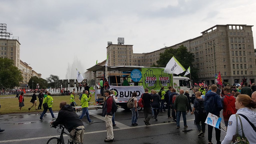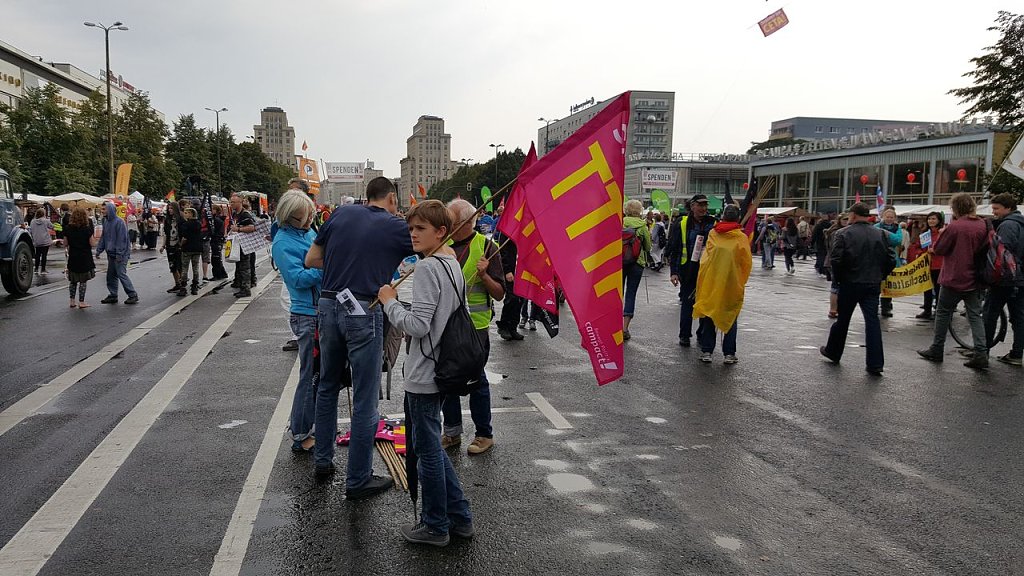 Selbst ein einstündiger Regenguss konnte die mehr als 70.000 Menschen in der Hauptstadt nicht abhalten, gegen diese Abkommen zu demonstrieren. Ein Bündnis von Parteien, Organisationen und Verbänden hatte dazu aufgerufen. Im Prinzip standen die beiden Worte CETA und TTIP beispielgebend für das, was die derzeitige Produktionsweise ausmacht: der Kapitalismus.