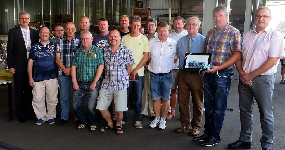 Links Geschäftsführer Tobias Müller sowie Werkleiter Dietrich Engelmann (3.v.r.) zwischen Mitarbeitern, die bereits 25 Jahre im Unternehmen tätig sind.