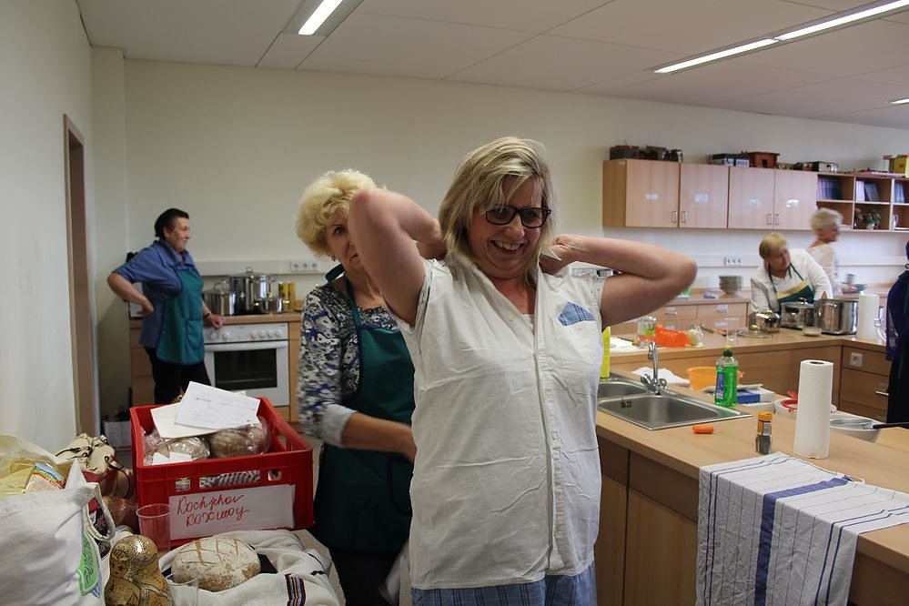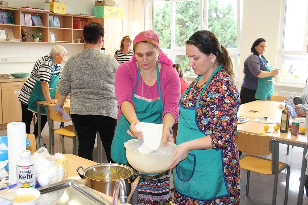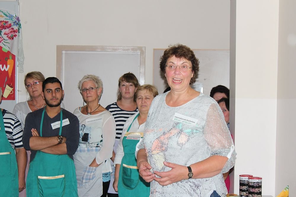 Katharina Weizel, Projektleiterin der Begegnungsstätte Migranten "Kontakt" und Karla Kreyer von der FAU begrüßten zu Beginn Gäste und Köche. Weizel und Kreyer lobten besonders die enge Zusammenarbeit mit der Östertalschule, die ja seit Jahren die Küche zur Verfügung stellt.