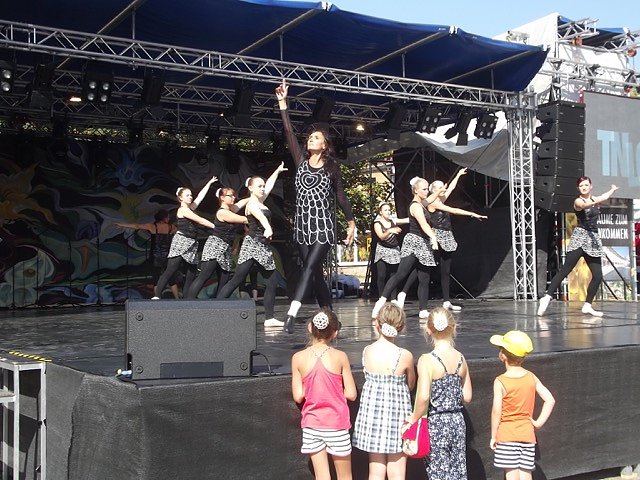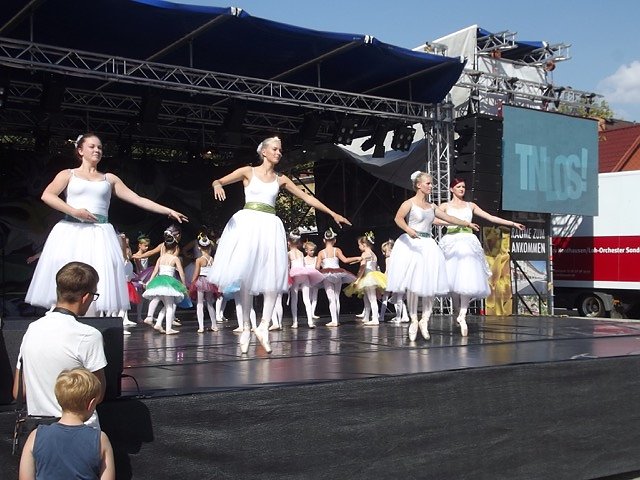Im Anschluss an den gelungenen Vormittag wurde die kulturelle Tradition in Nordhausen fortgesetzt mit einem kleinen und feinen Programm im Rahmen des jährlichen Theaterfests, das unter dem Motto Neues Spiel, neues Glück erstmals unter der Leitung des neuen Intendanten auf dem Theatervorplatz regen Besucheransturm auslöste. In einem 20minütigen Programm präsentierten die Eleven ihre tänzerische Vielfalt vor den bei sonnigem Wetter restlos gefüllten Zuschauerreihen, von ihrer Interpretation von Nothing Else Matters von Metallica über Harry-Potter-Filmmusik bis hin zu Walzer nach A. Glasunow und Spitzentanz nach J.S. Bachs Air.