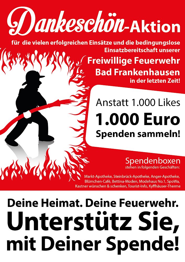 Zum Bauernmarkt am letzten Wochenende entstand die spontane Idee einiger Gewerbetreibenden, man müsse doch einfach einmal der Feuerwehr Danke sagen. Sie beschlossen spontan, eine Dankeschön-Aktion zu organisieren und seit gestern hängen in Bad Frankenhausen die entsprechenden Plakate und die Spendenboxen stehen in bestimmten Einrichtungen. Silke Kastner vom Geschäft Kastner wünschen & schenken sagte: Was unsere Kameraden hier über Monate hinweg leisten, ist einfach nur Klasse. Sie geben alles für unsere Sicherheit und sind Tag und Nacht zur Stelle wenn sie gebraucht werden. Wir wollen einfach einmal Danke sagen und haben spontan diese Dankeschön-Aktion ins Leben gerufen und hoffen auf viele Unterstützer.
