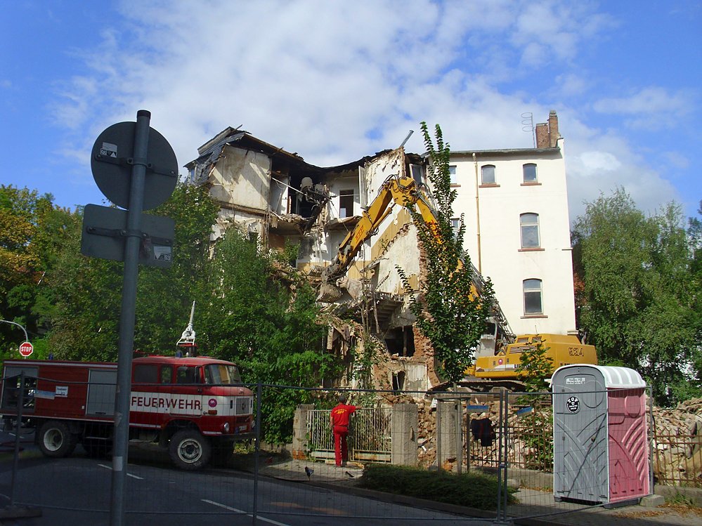 Der Bagger frisst sich unaufhaltlich in und durch die alte Bausubstanz. Die Wasserdusche vom Feuerwehrfahrzeug dämmt auch die Staubentwicklung gut ein. Wenn es so weiter geht mit den Abrissarbeiten, dann wird in wenigen Tagen fast nichts mehr an das ehemalige Hotel Fürstenhof, dann SED Kreisleitung in Sondershausen und zuletzt als Finanzamt genutzt (vor dem langen Leerstand) erinnern.