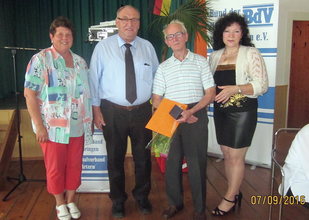 Am 7. September 2016 haben wir unseren Tag der Heimat in der Region Kyffhäuserkreis und Landkreis Sömmerda durchgeführt. Die Besonderheit war, dass unser Vertriebenenverband nun seit 25 Jahren besteht. Wir waren wieder in Ringleben/Kyffh. im Landgasthof "Zum Ring" auf dem Saal zu Gast und haben mit 71 Teilnehmern beide Anlässe sehr würdig begangen.