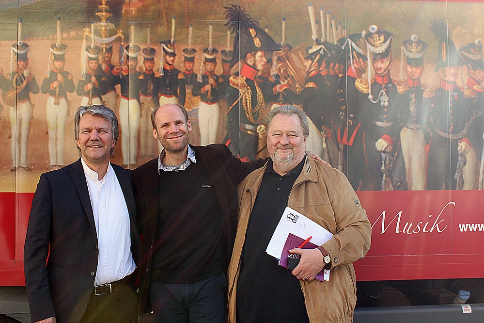 Daniel Klajner, Christoph Ehrenfellner und der neue Generalmusikdirektor Michael Helmrath von links nach rechts vor dem Instrumentenwagen.
