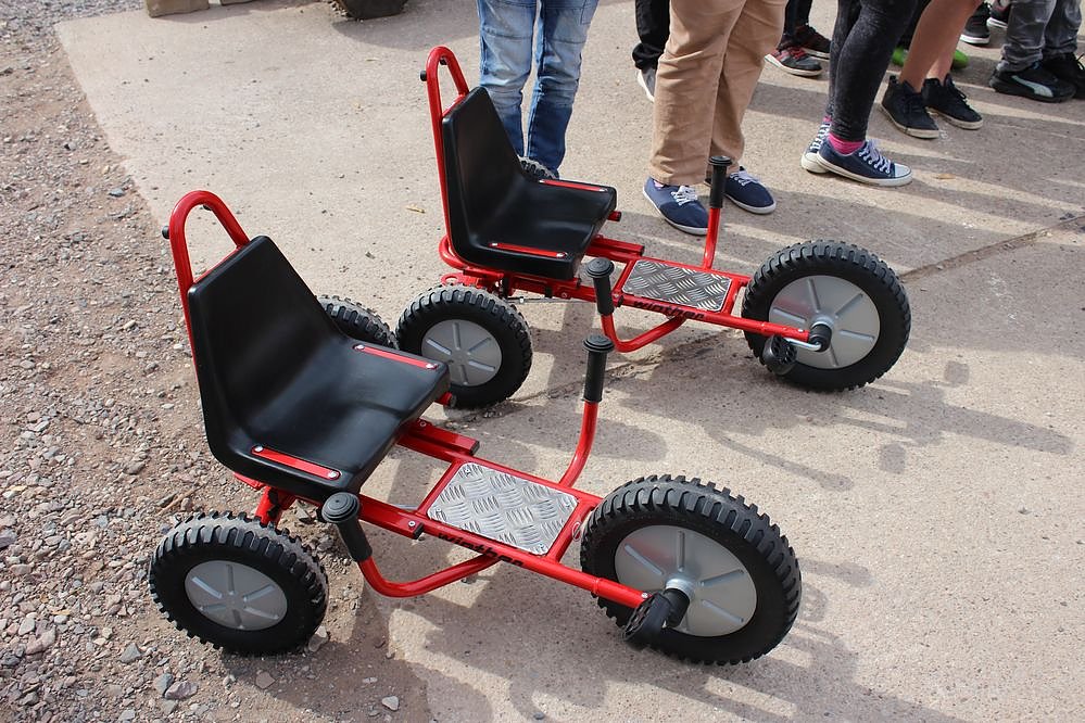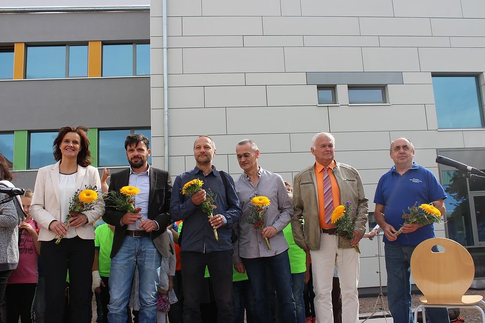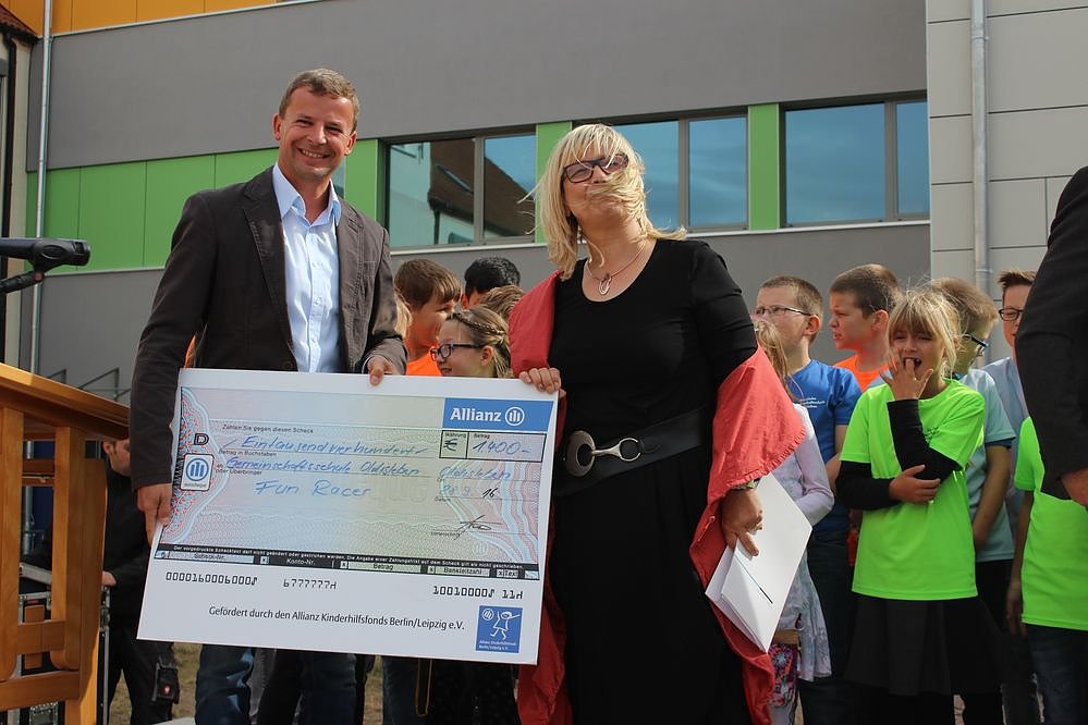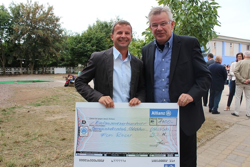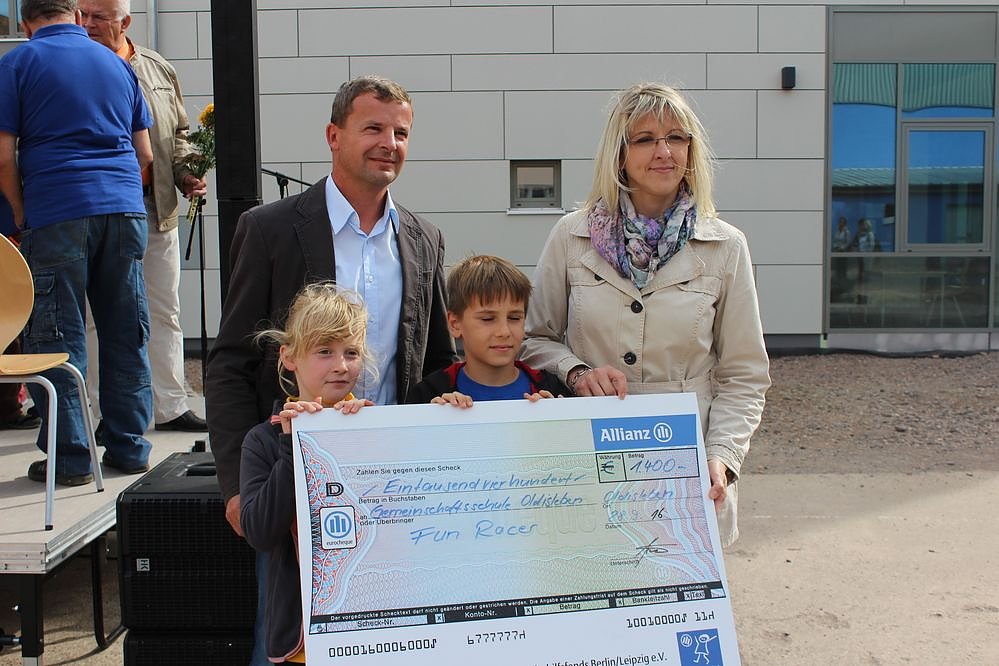 Natürlich waren auch Vertreter der verschiedenen Baufirmen, und Architekten erschienen. Von Vertrtern der Allianz Versicherung gab es noch einen Scheck über 1.400 Euro. Mit dem Geld wurden u.a. zwei Fahrgeräte für die Schule angeschafft.