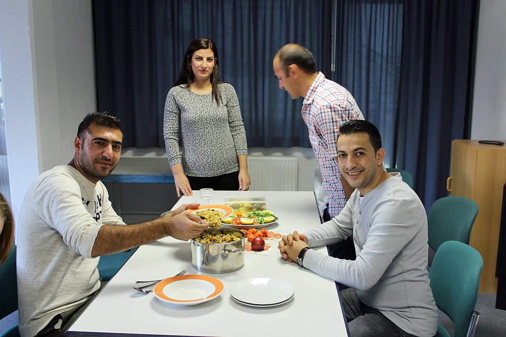 Alle Gäste tragen aktiv zum Gelingen des Tages bei. Clever war diese Gruppe aus dem Irak. Frei nach dem Motto wir warten nicht bis es etwas gibt, wir bringen gleich etwas Vorgekochtes mit. Das Beryane ein Reisgericht u.a. mit Nüssen der besonderen Art, kn kannte sie nicht, schmeckte sehr lecker, als kn auch eine Kelle voll abbekam.