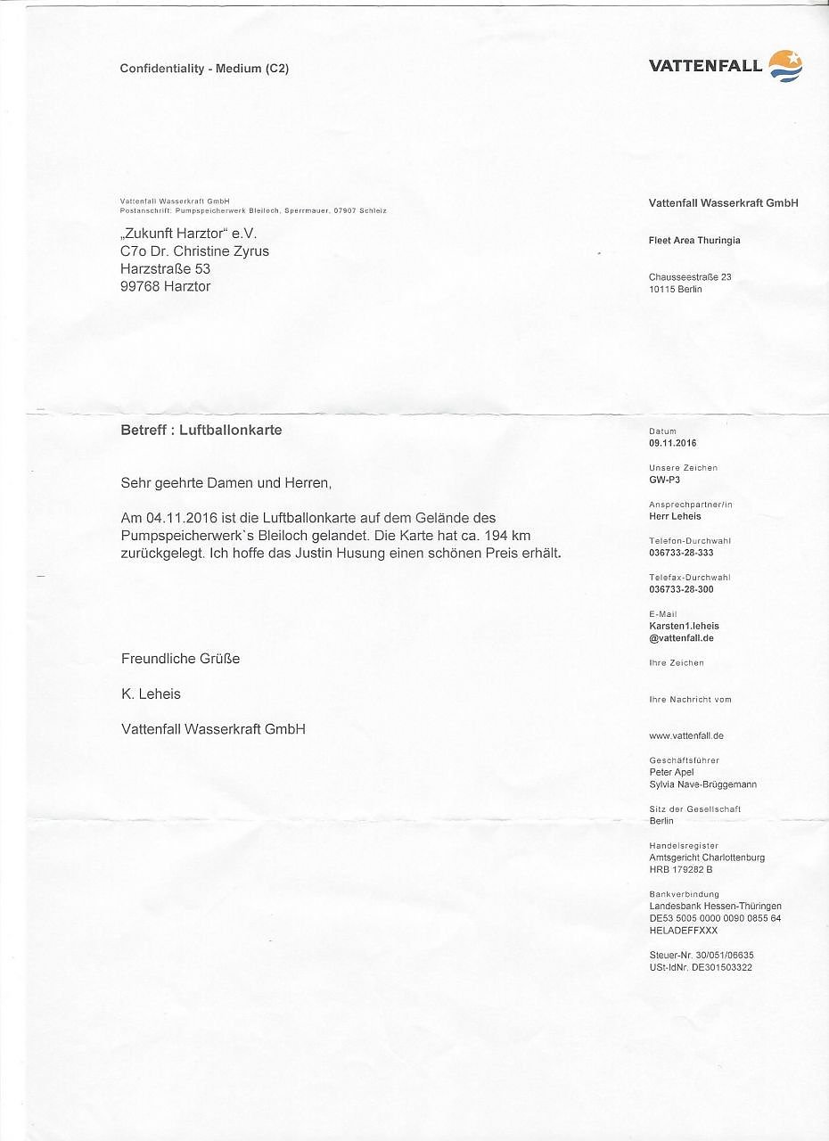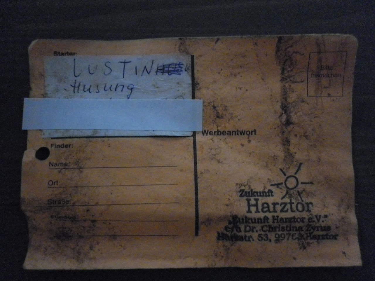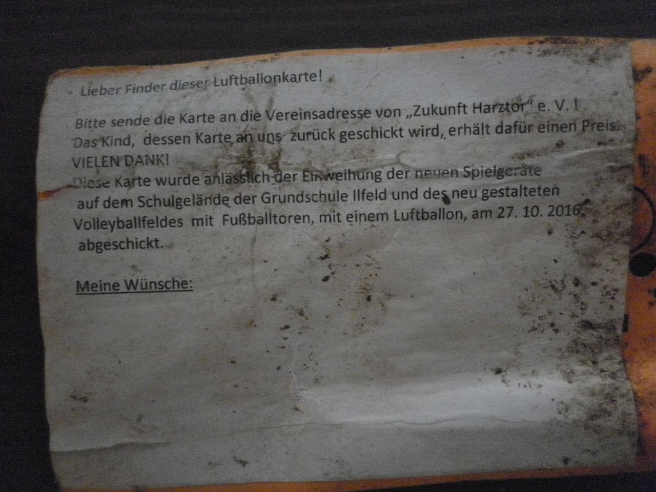Justin hatte sie mit Unterstützung seiner Mutti, zur Spielplatzeinweihung auf dem Gelände der Grundschule Ilfeld Ende Oktober ausgefüllt und mit einem Heliumballon auf die Reise geschickt. Sie wurde am 4. November, auf dem Gelände des Pumpspeicherwerk`s Bleiloch gefunden und von Karsten Leheis, Fa. Vattenfall, freundlicherweise den Verein Zukunft Harztor geschickt.