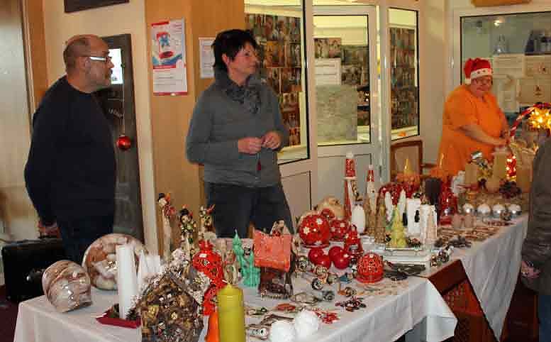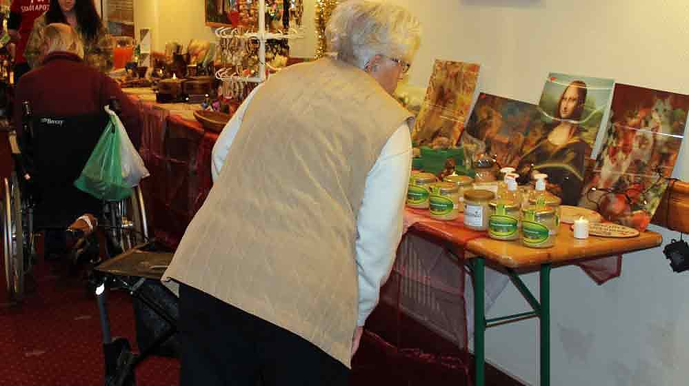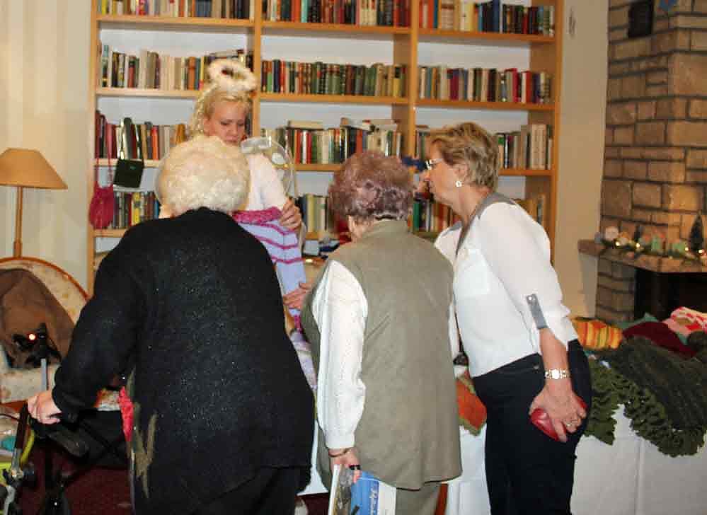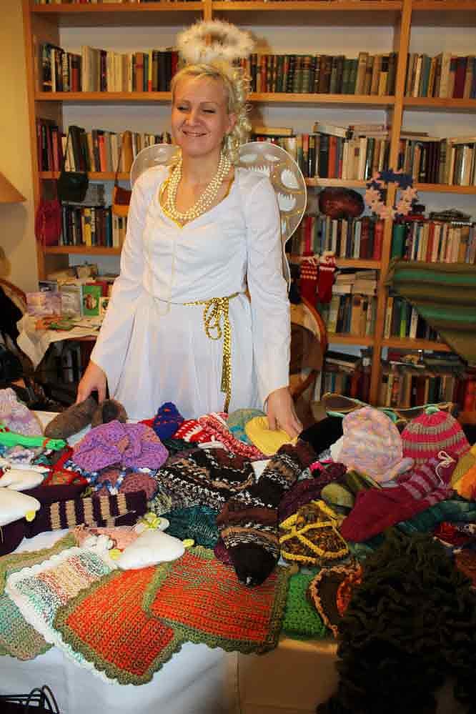 Der Weihnachtsengel verkauft Strickwaren, die von den Bewohnern in der Seniorenresidenz gestrickt wurden.