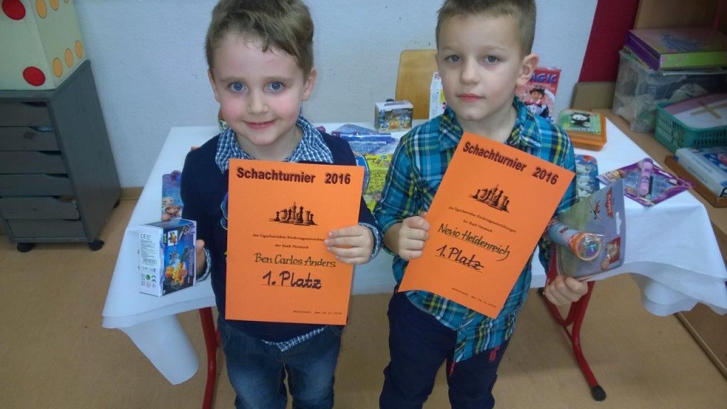 Gespielt wurden drei Partien Schach mit wechselnden Gegnern. Drei Siege gelangen dabei Ben Carlos Anders und Nevio Heidenreich aus der Kita Regenbogen, die beide zu den allerjüngsten Spielern des Turniers gehören.