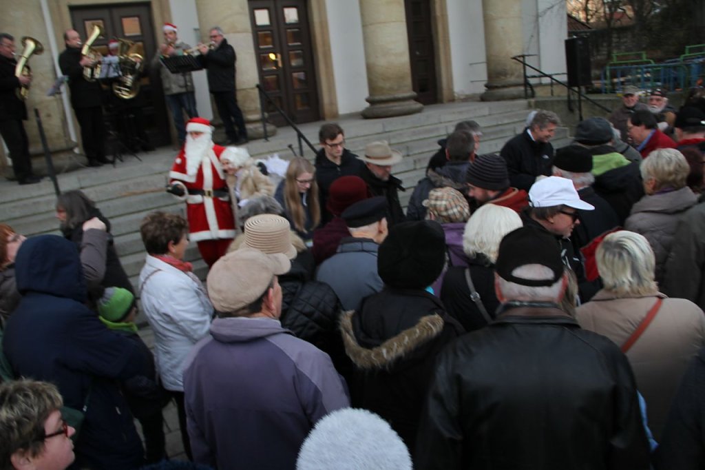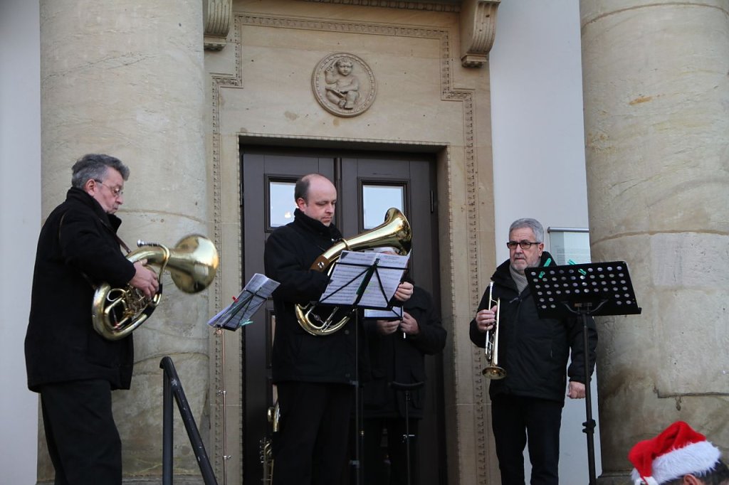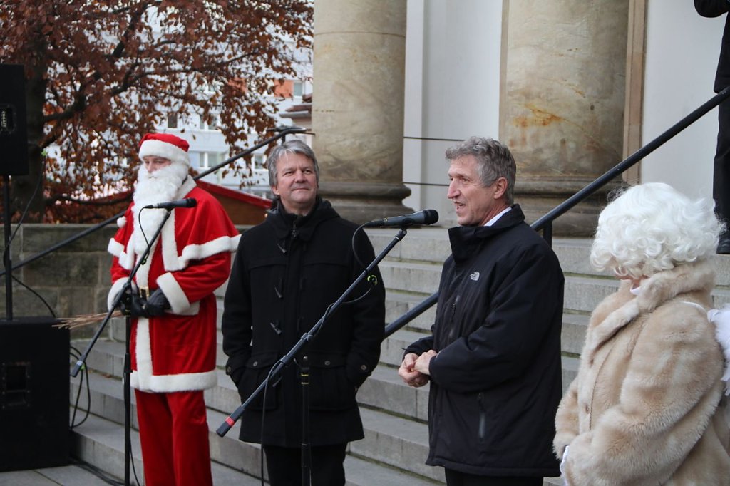 Neben dem Weihnachtsmarkttypischen Angeboten gibt das Theater dem Ganzen das gewissse Exta: die Türchen des großen Theateradventskaldenders werden sich auch in diesem Jahr wieder öffnen und Engel samt Weihnachtsmann die Kinder überraschen. Für Theaterintendant Daniel Klajner wird es der erste Weihnachtsmarkt vor dem Haus sein und er musste auch gleich zusammen mit Oberbügermeister Zeh zur Tat schreiten - der Riesenstollen wollte angeschnitten und verteilt werden.