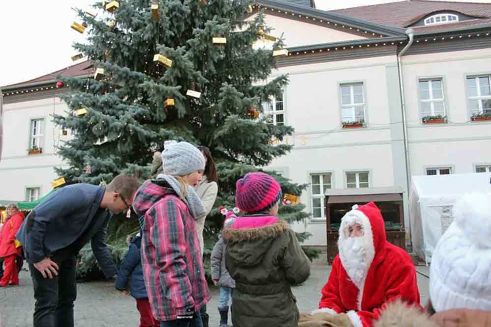 Natürlich gibt es auch einen Weihnachtsbaum. Der kam aus dem Ortsteil Udersleben. Und hoher Besuch kam auch aus Udersleben. Der Laubkönig von 2015/2106 Tobias I. war gekommen. Weil er nicht mehr regiert, ließ er sich von Fliederkönigin Rebecca I. und Fliederprinzessin Hannah-Katharina I. flankiert.
