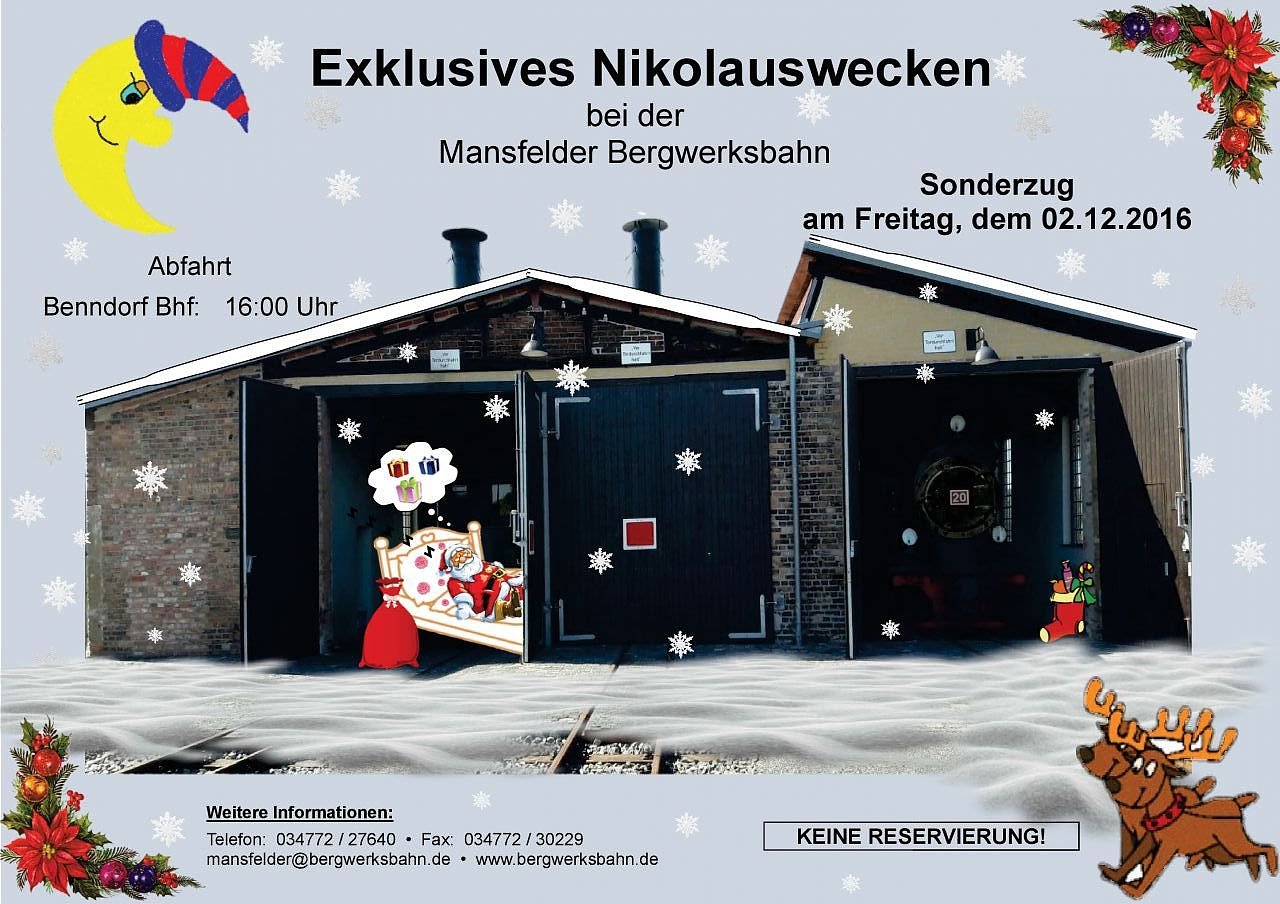 Die Mansfelder Bergwerksbahn informiert: 2016 erstmalig im Programm, das Nikolauswecken am 02. Dezember 2016, Abfahrt 16.00 Uhr im Bahnhof Benndorf. Keine Reservierung notwendig!