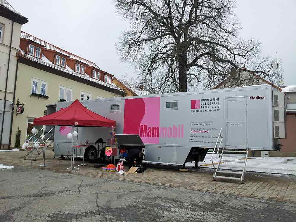 Das Mammobil steht zwischen dem 09. Januar 2017 bis Mitte Februar 2017 in Bad Frankenhausen wie auch vor 2 Jahren wieder auf dem Markt gegenüber dem Rathaus. Es werden die Frauen wohnhaft in den Postleitzahlen 06567 Bad Frankenhausen, 06578 Bilzingsleben und 99707 Kyffhäuserland dorthin eingeladen.