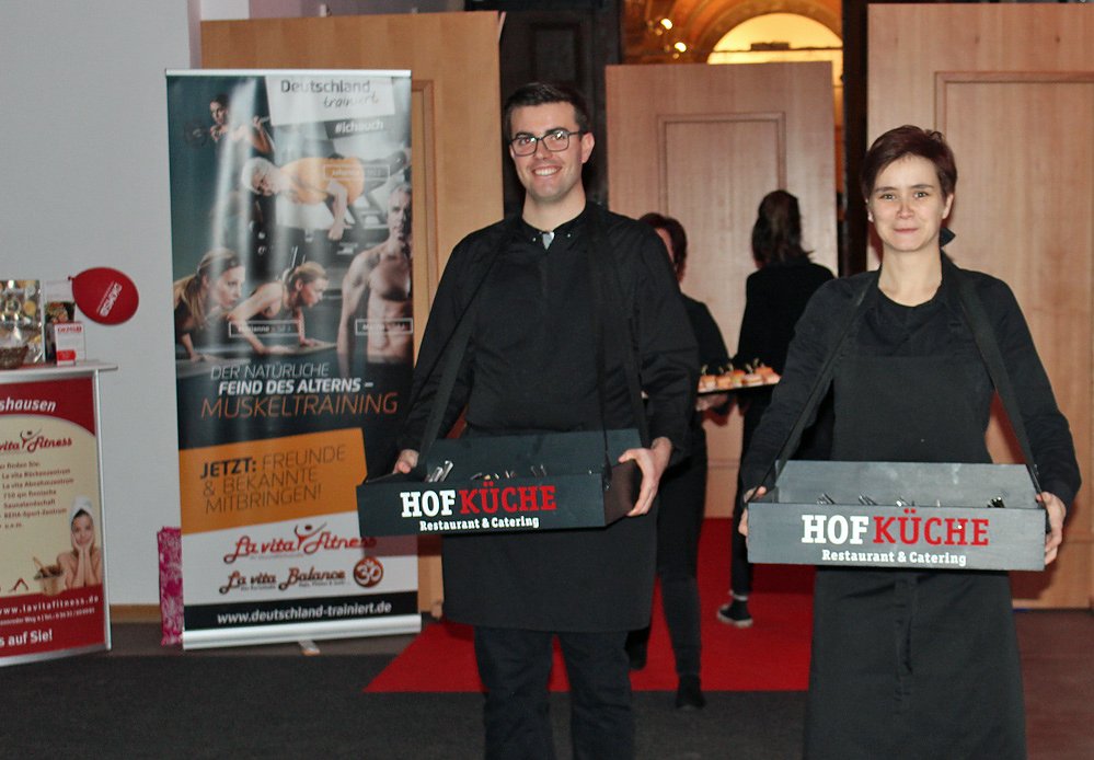 Die Kreativköche der Hofküche Sondershausen servieren die leckeren Speisen nicht an einem großen Buffet, wao es Gedrängel hätte geben können. Mit Bauchladen und Tablett schärmte man aus und servierte die leckeren Speisen. Dabei konnte der Besucher sich gleich beraten lassen, was war was oder sagte nur, ich nehme das vom anderen Bauchladen.