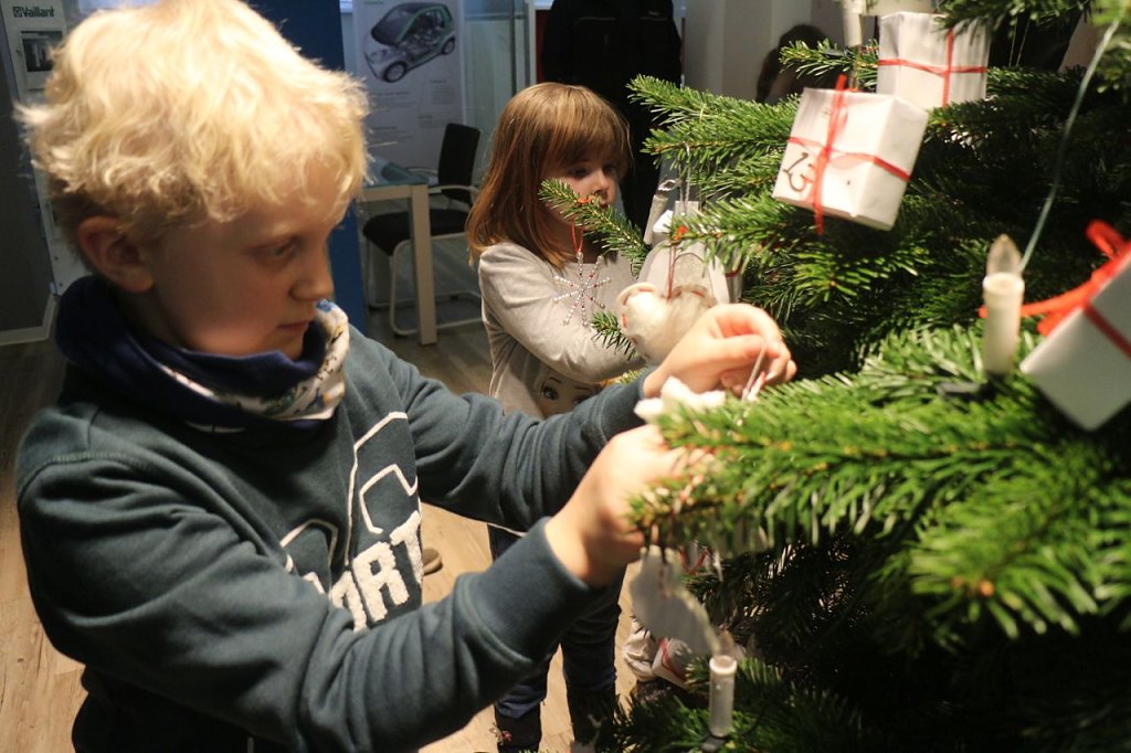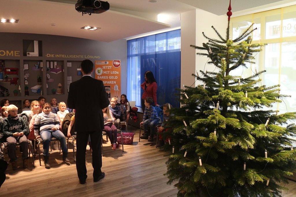 Besonders verbunden ist das Unternehmen unter anderem mit der Bertold-Brecht-Schule. Auf dem Petersberg sind die Stromexperten regelmäßig mit Vorträgen und Projekten zu Gast. Als Dank revanchierte sich die Grundschule heute wieder mit selbstgebastelten Festtagsschmuck für den Weihnachtsbaum der Filiale in der Rautenstraße. Am Immergrün hängen seit heute neben Rentieren, Sternen und Glocken auch kleine Päckchen, die jüngere Besucher dann auch gerne öffnen dürfen. Was sich darin verbirgt, das wurde noch nicht verraten.