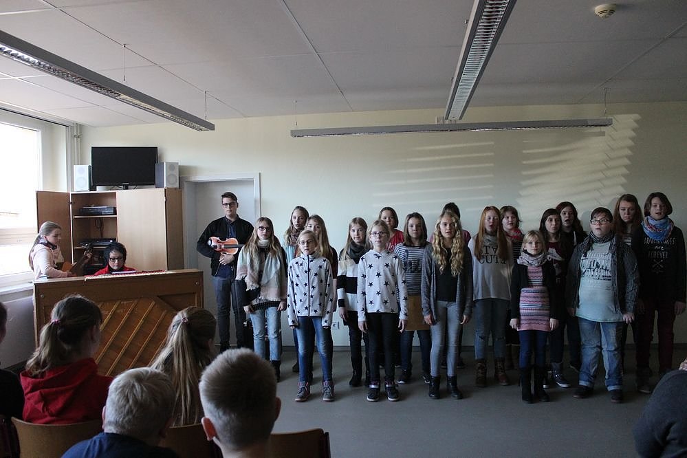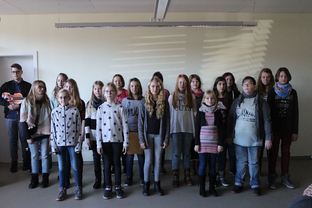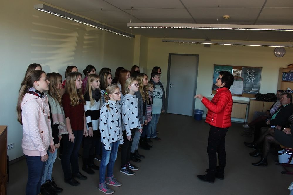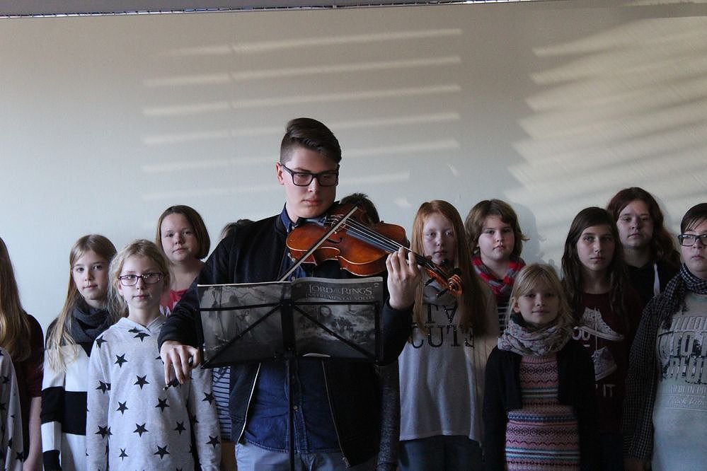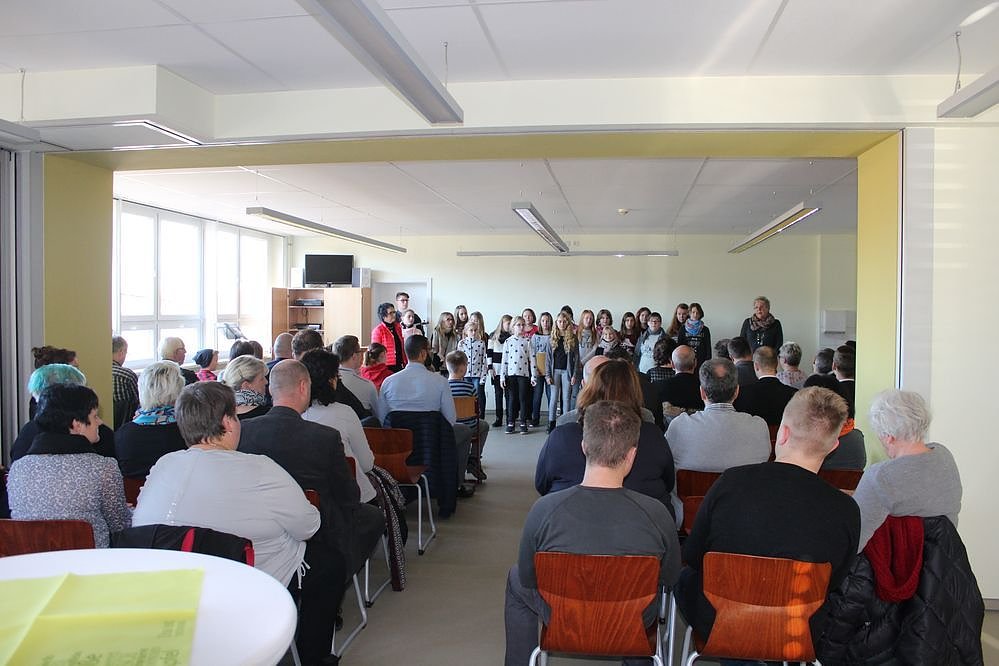 Zur Begrüßung der Gäste sang der Schulchor unter der Leitung von Petra Trautmann den Gästen eine Ständchen. Auch Dominique Kühn mit seiner Geige gab der Eröffnung im neuen Multifunktionsraum den feierlichen Rahmen.