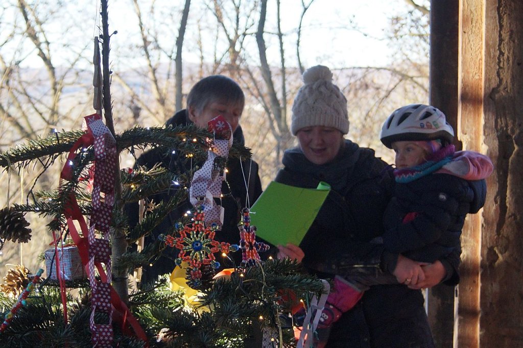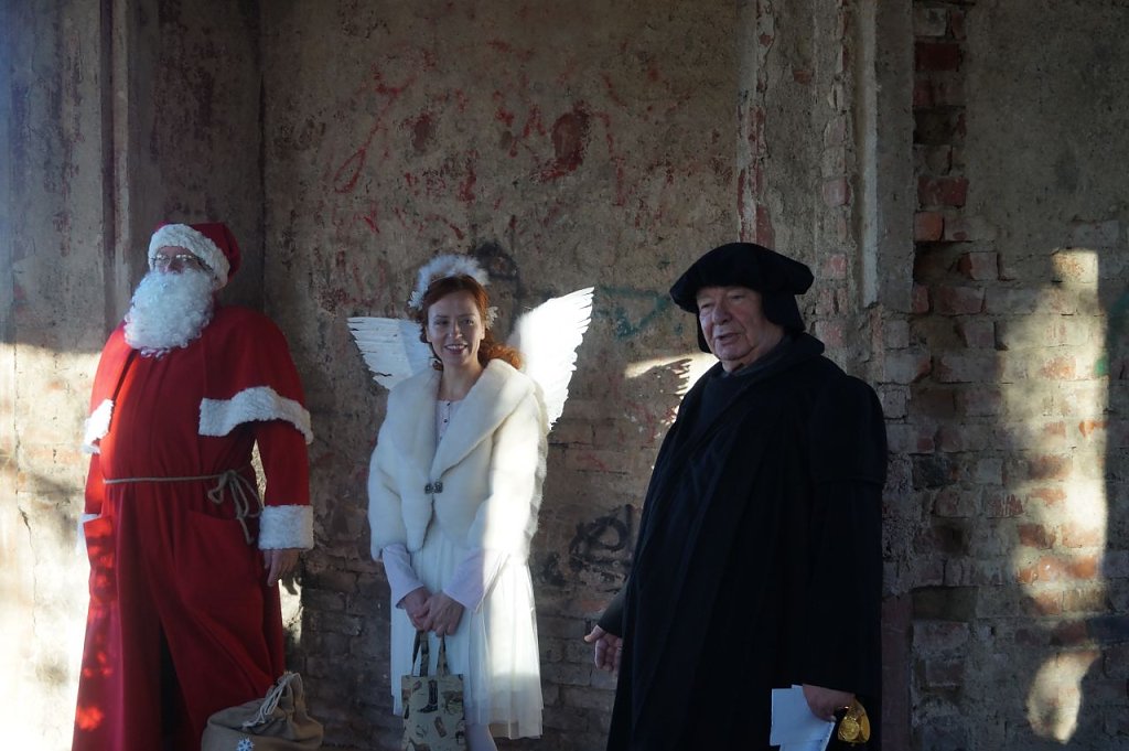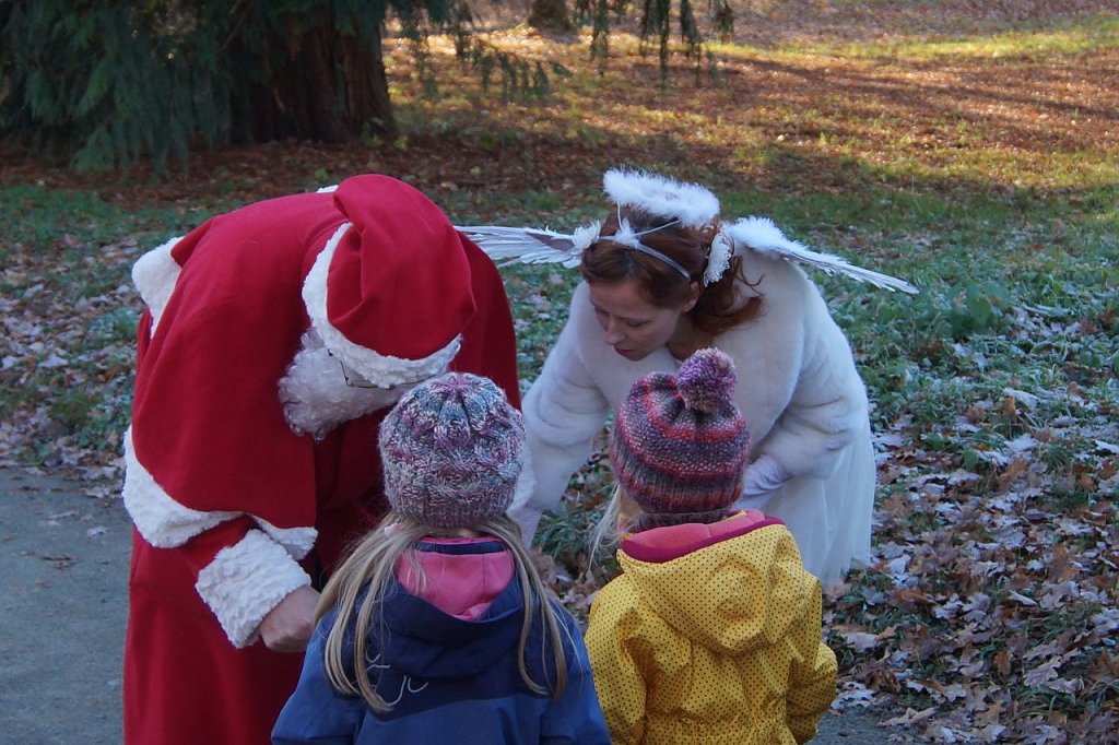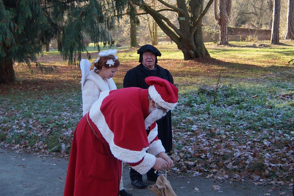 Mit seinem Gefolge, nämlich dem Weihnachtsengel und Martin Luther, empfing der Weihnachtsmann seine Gäste zu einem gemeinsamen Spaziergang durch den Park. Ausgangspunkt war der Pavillon, in dessen Mittelpunkt ein bunt geschmückter Weihnachtsbaum funkelte. Nach einem gemeinsamen Singen des Weihnachtsliedes Es ist für uns eine Zeit angekommen, durfte der jüngste Gast die erste Weihnachtsüberraschung aus dem Weihnachtsbaum entgegen nehmen.