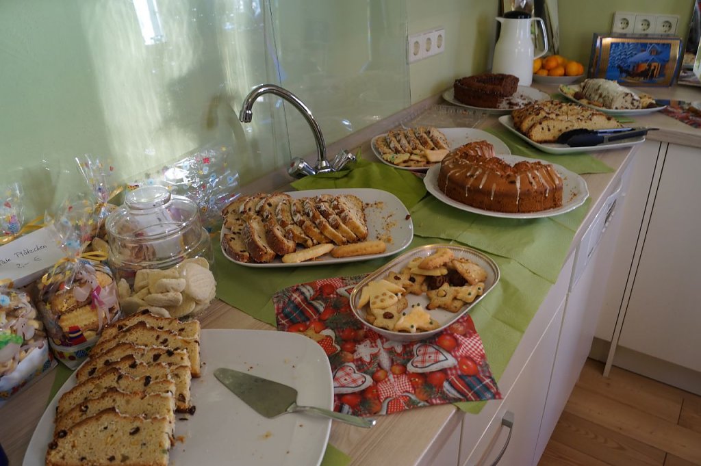 Im Anschluss an den Spaziergang fand vor dem Lese-Cafe des Parks das Anschneiden des Stollens statt. Die ehrenvolle Aufgabe übernahm der Weihnachtsengel. Wer wollte, erwärmte sich bei einem heißen Teller Soljanka aus dem Kessel oder einer Tasse Glühwein. Wem es zu kalt war, der suchte sich ein Plätzchen im warmen Cafe. Bei besinnlicher Weihnachtsmusik wurde heißer Kaffee und eine große Auswahl an selbstgebackenen Kuchen angeboten.