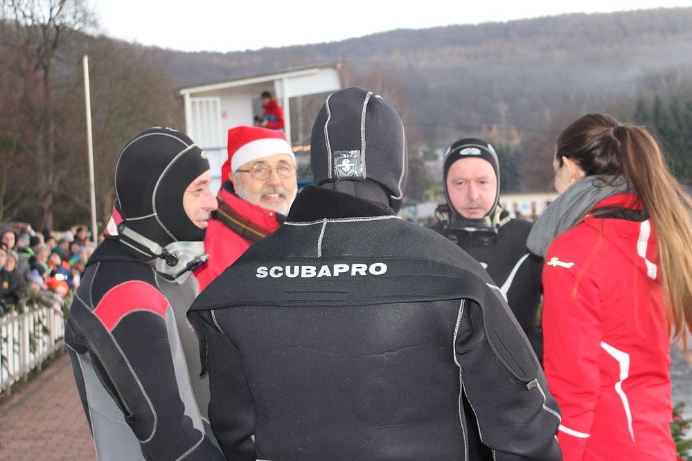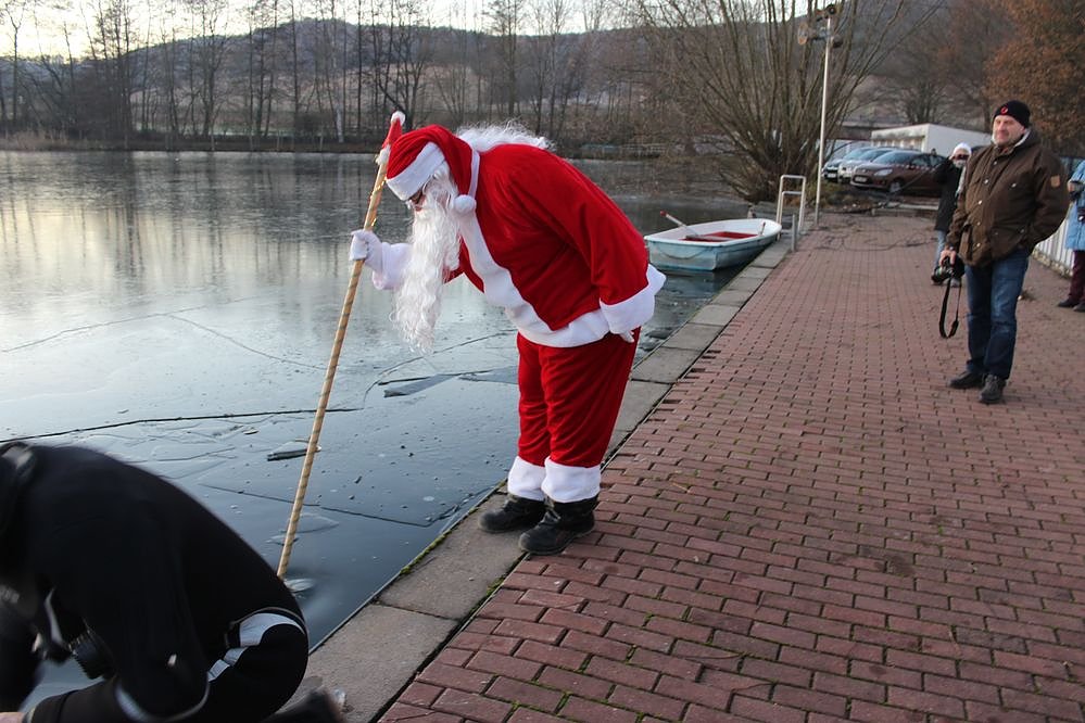 Dann aber war es so weit. Der Weihnachtsmann gab den Startschuss und beobachtete aus sicherer Entfernung (man will ja nicht ins Wasser fallen), wie der Vorsitzende des Tauchsportvereins Delphin, Holm Gerlach, den vier Tauchern den Weihnachtsbaum mit eingeschalteten Weihnachtslichtern reicht.