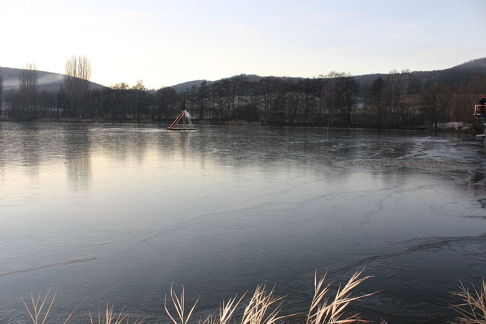 Die Eisschicht ist teils schon fünf Zentimeter stark. Aber, und die Warnung sei gleich ausgesprochen, für das Eislaufen ist die Schicht noch viel zu dünn! Nicht das noch jemand auf die verrückte Idee kommt, hier oder an anderen Gewässern aufs Eis zu gehen. Da braucht es anhaltenden Frost der länger wirkte!