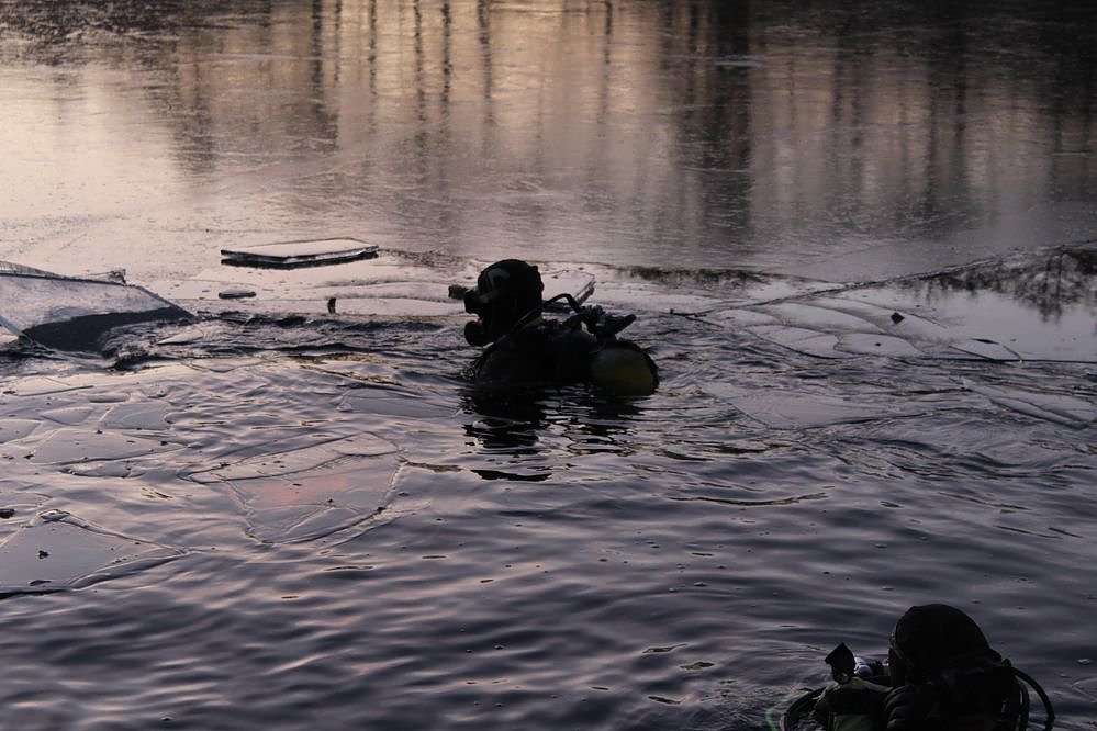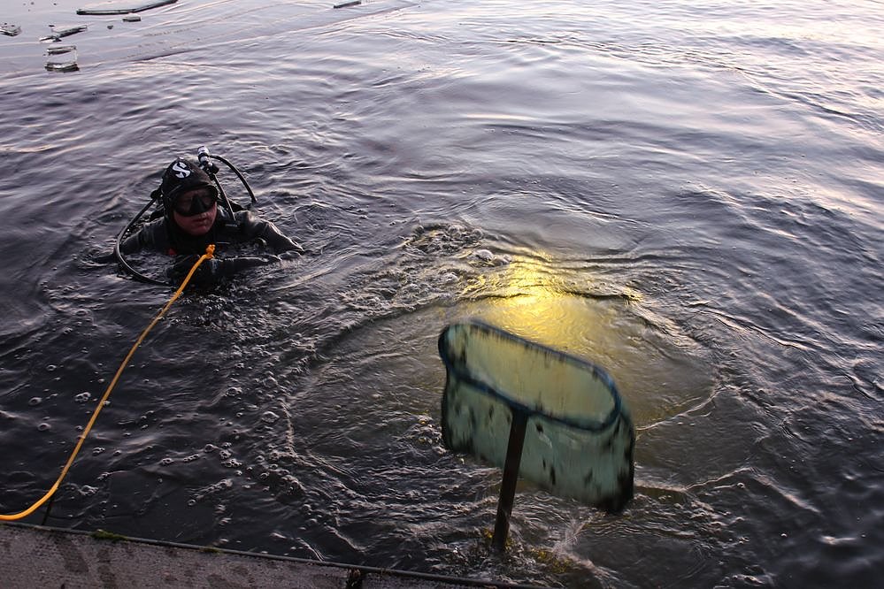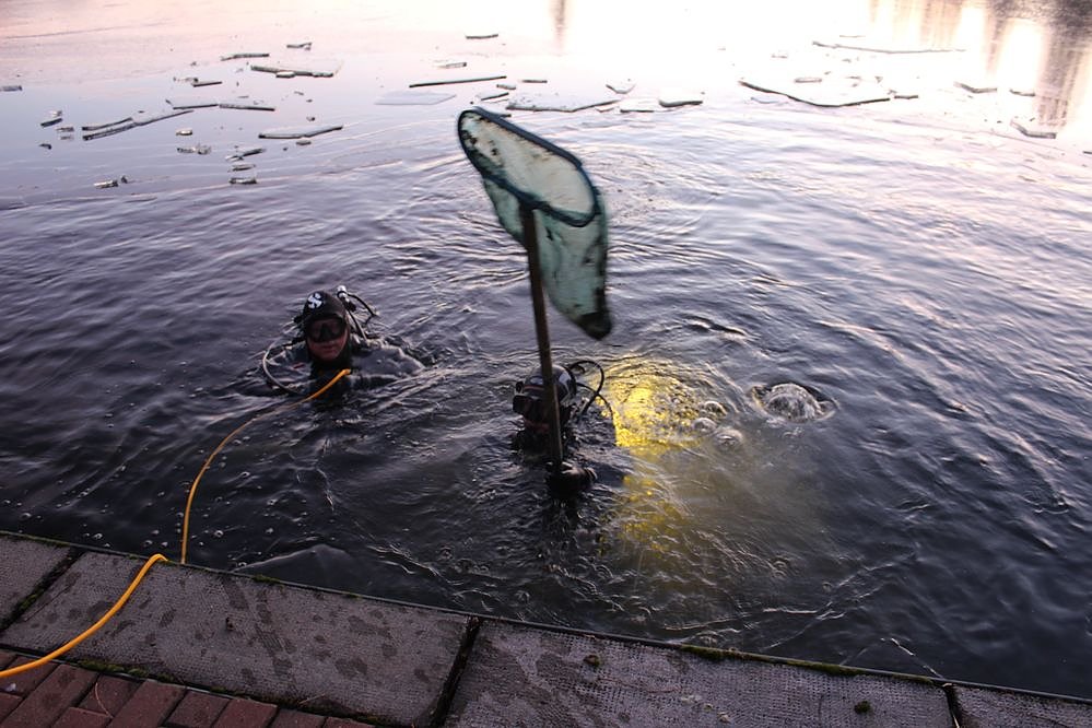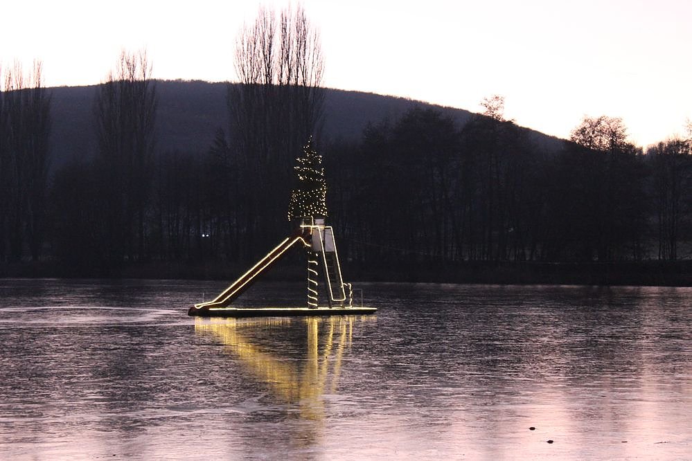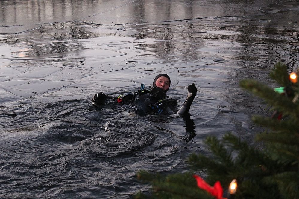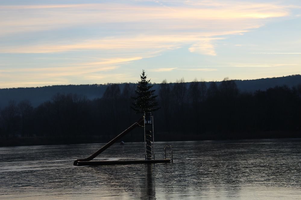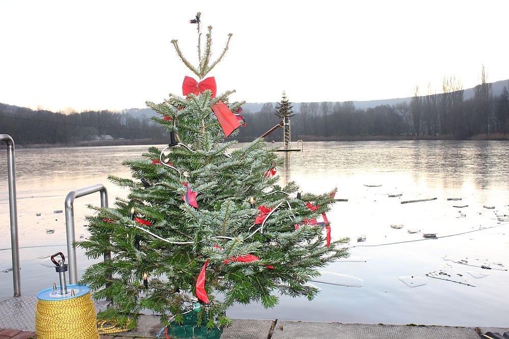 Das Thermometer des Schwimmbades brauchte man nicht zu befragen, wie kalt das Wasser war. Es war mehr als brrrrr, denn der Bebraer Teich hatte schon eine Eisschicht und für das Tauchen musste die Eisdecke erst beseitigt werden, ehe der Weihnachtsbaum versenkt werden konnte: