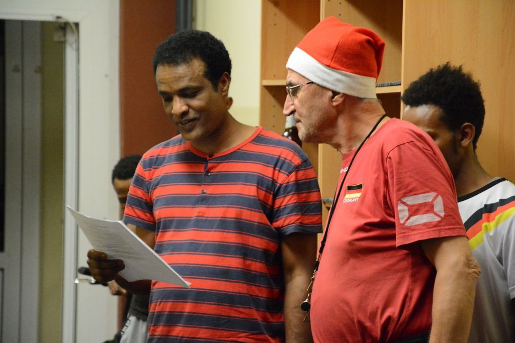 Nach dem Turnier wartete auf die Eritrea noch eine kleine Überraschung. Der Weihnachtsmann hatte sich im Foyer der Turnhalle eingefunden und übergab kleine Präsente. Doch einfach so wollte er ihnen die Geschenke nicht überlassen. Bei der Übergabe musste jeder einen Vers eines deutschen Weihnachtsgedichtes wie "Von einem Schneemann und seiner Frau" vorlesen. Dabei konnte man sehr gut hören, wer schon besonders fleißig beim Lernen der deutschen Sprache ist. Es gaben sich dennoch alle große Mühe beim Lesen und erhielten von den Anwesenden Applaus. Nach drei Stunden voller Spaß und Freude endete der Abend mit einem gemeinsamen Foto.
