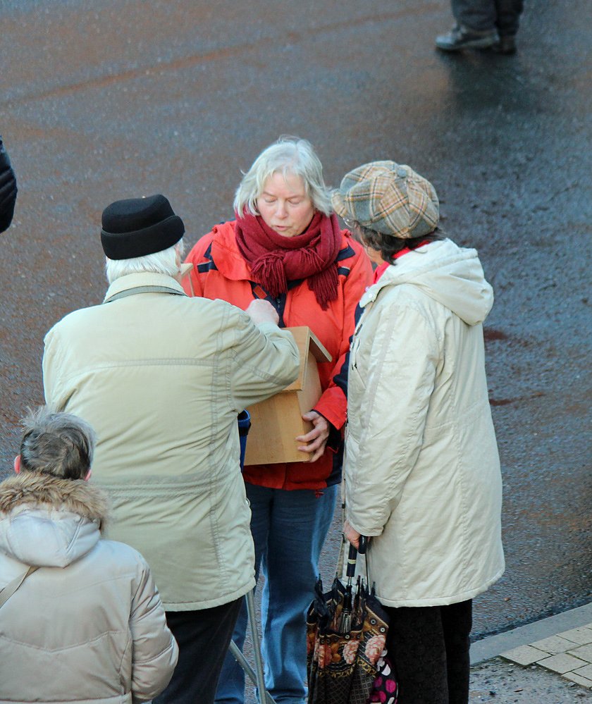 Obligatorisch, meist schon vor dem Turmblasen und auch noch danach, wird ein Glühwein, oder auch zwei, getrunken. Aber auch das eine oder andere Glas Sekt wurde schon mal getrunken, um das Warten auf den Weihnachtsmann zu erleichtern. Aber auch alkoholfreier Punsch oder Kaffee wurde angeboten. Der Förderverein der Cruciskirche wurde von der Düne e.V. unterstützt. Der Erlös kommt, wie in den letzten Jahren dem Projekt Bürgerzentrum Cruciskirche zu Gute. Monika Schreier von der Düne zog aktiv mit der Spendenkirche durch die Besucher und erhielt für den Förderverein so manche Spende.