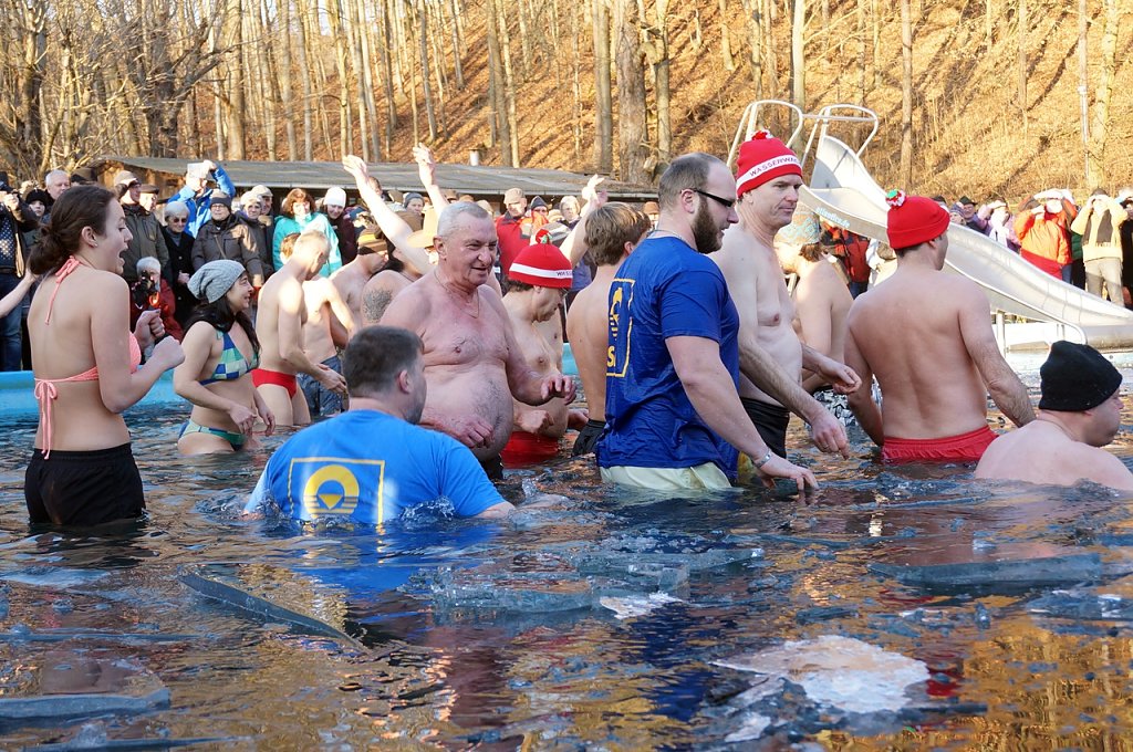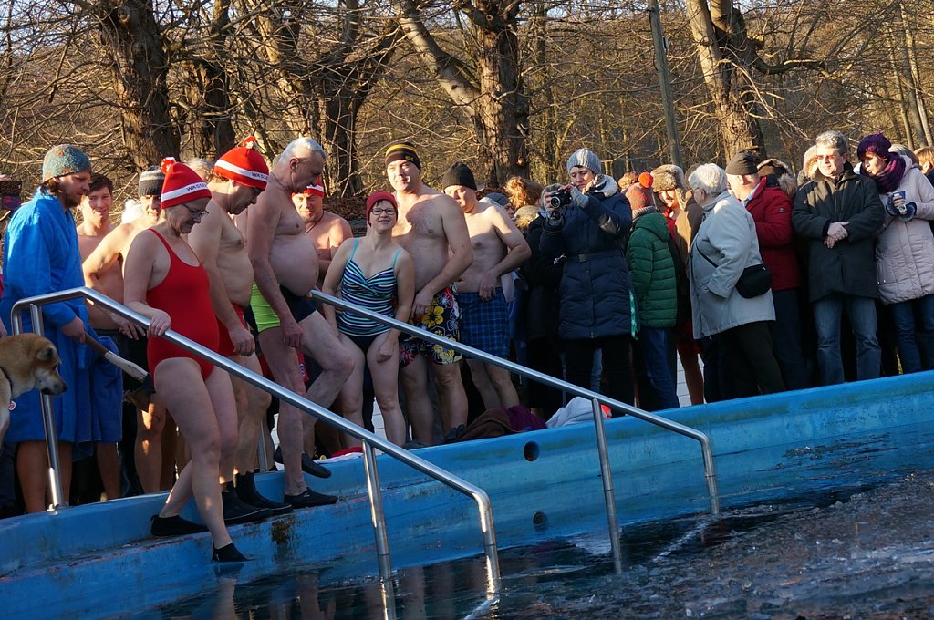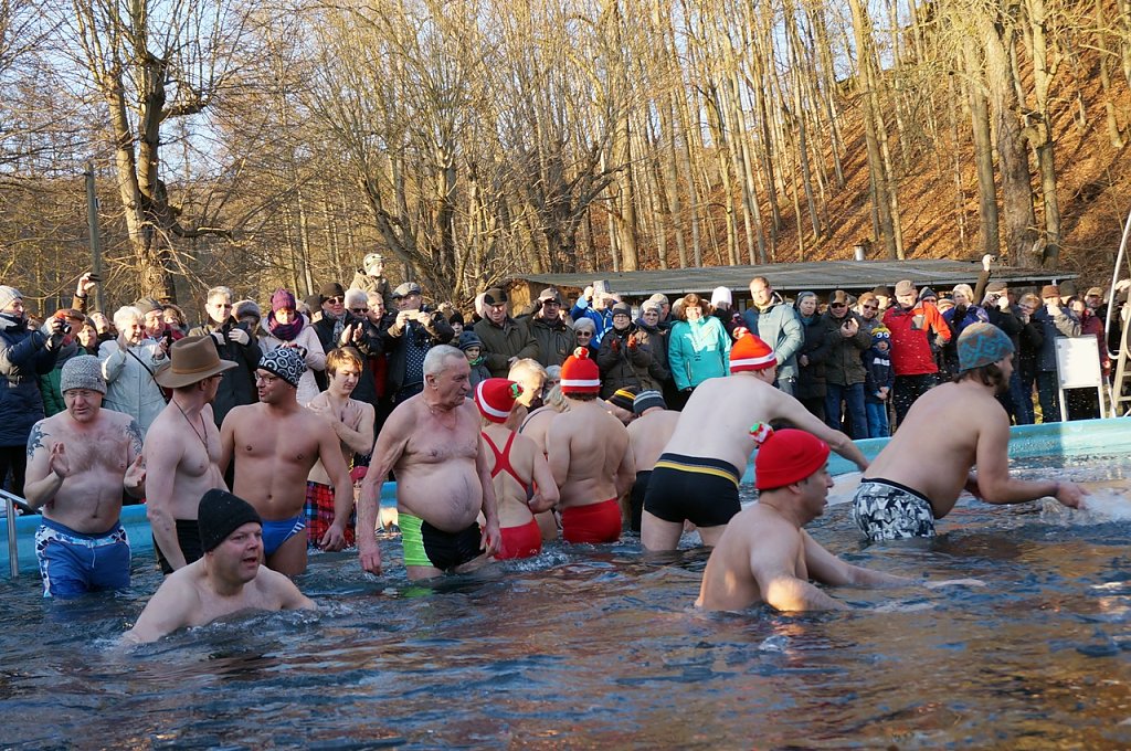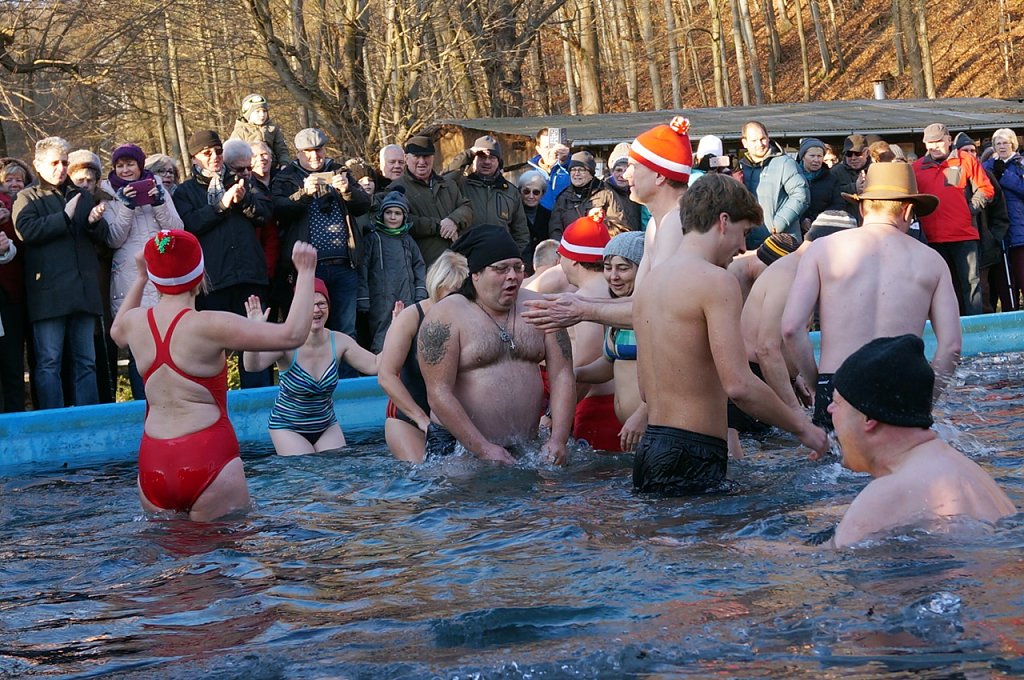 Wie er nahmen noch weitere 22 Badewillige am diesjährigen Anbaden teil. Punkt 15.00 Uhr ging es nach einem kurzen Aufenthalt in der Schwitzhütte ins Wasser, bejubelt von den rund 300 Besuchern. Der Förderverein des Waldbades hat diese Veranstaltung wieder toll organisiert, freute sich auch Neustadts Bürgermeister Dirk Erfurt. Ein besonderer Dank gilt den Mitgliedern des Fördervereins und den vielen ehrenamtlichen Helfern, erklärte Anne Dumjahn, Vorsitzende des Fördervereins, dem aktuell rund 200 Mitglieder angehören. Sie hatten wieder für das leibliche Wohl der Besucher gesorgt. Ende Januar soll die nächste Mitgliederversammlung des Vereins stattfinden. Dann wird die Förderung des Waldbades in der Satzung fest geschrieben, sagte die Vorsitzende. Geplant ist in diesem Jahr auch den restlichen Zaun um das Bad gemeinsam mit der Gemeinde zu erneuern. 2016 konnte bereits die Hälfte durch Lottomittel renoviert werden.